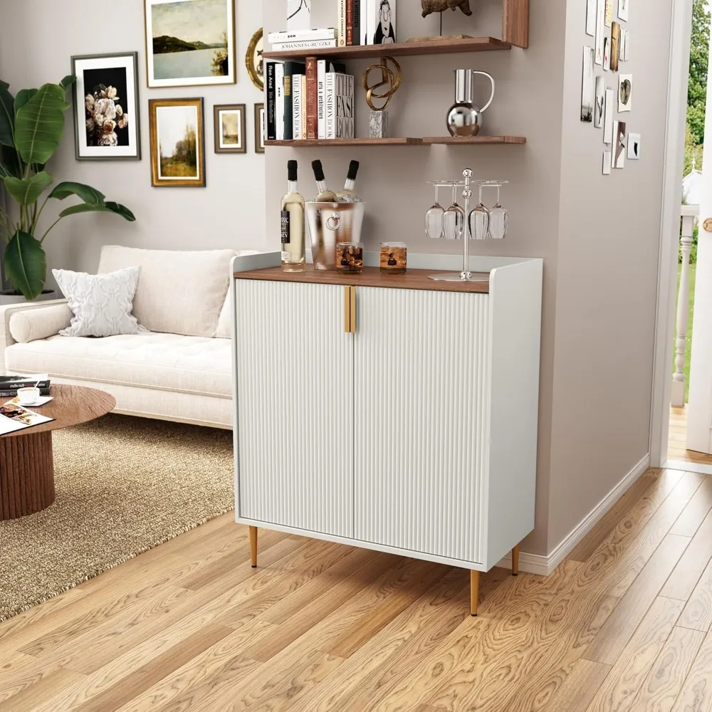 Wine Bar Cabinet with Fluted Texture, Modern Coffee Cabinet with Wine Rack&Glass Holder, White Kitchen Buffet Sideboard
