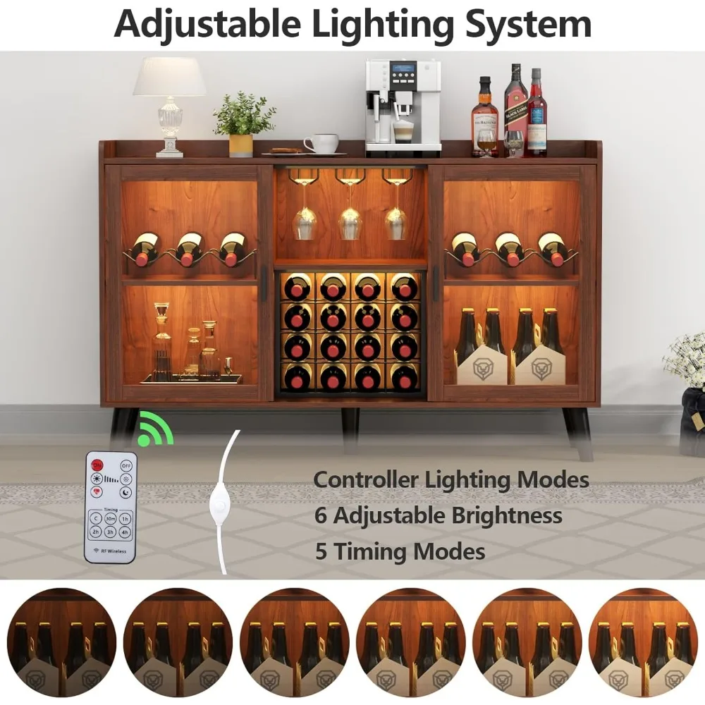 - 🍹【Bar Cabinet with LED Lights】This wine bar cabinet is equipped with an adjustable LED light strip, which adds charm to your home and creates a very comfortable and romantic atmosphere. This light strip can be adjusted the brightness of the light and set the timing mode by remote control. It shows your favorite wine and tableware beautifully and adds fashion and beauty to your home, living room, kitchen, bedroom, etc.