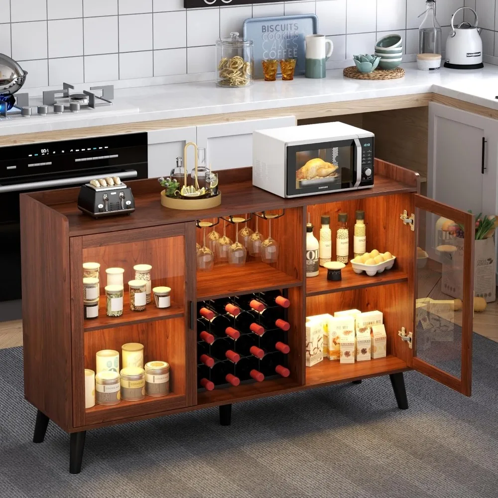 - 🍻【Ample Storage Space】This bar cabinet adopts an integrated design, which combines the wine rack, glass holders, and storage cabinet. With open storage spaces and a storage cabinet with two Glass doors, this bar cabinet offers plenty of space to organize your stuff. The spacious tabletop is great for a coffee maker, microwave oven, etc. You can add or remove wine racks and glass holders to meet the actual use requirements. Adapted for any place such as the living room, dining room, or kitchen.