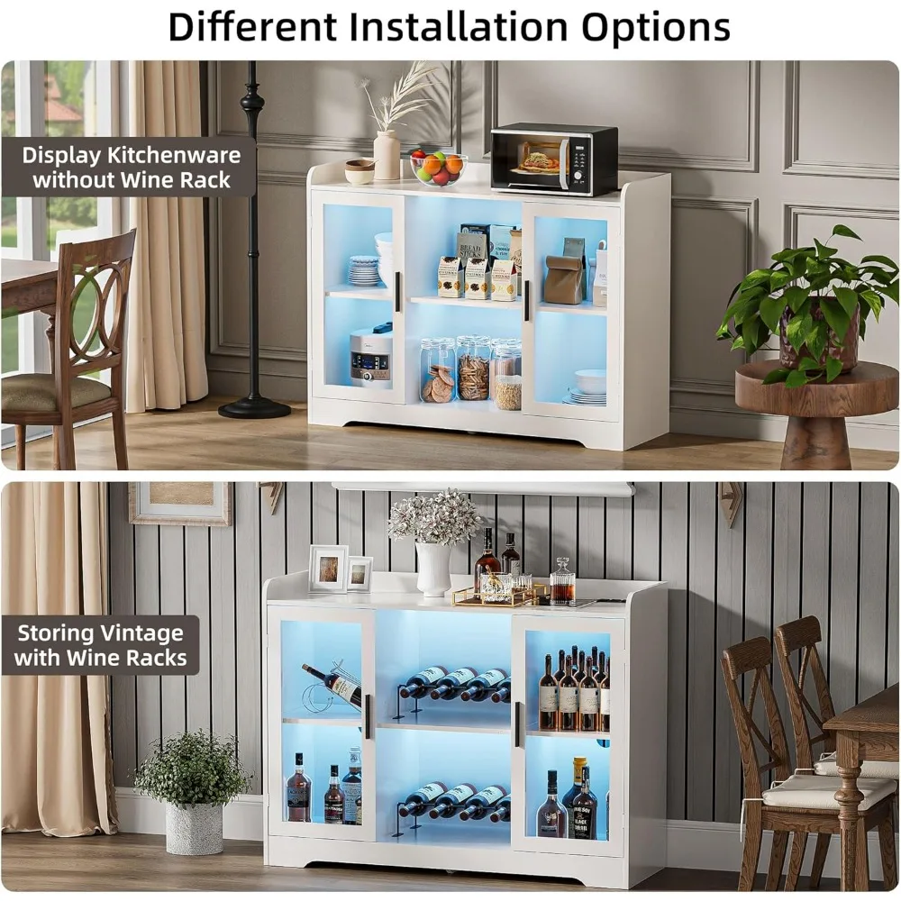 - 【Power Outlet Sation】 The bar cabinet is equipped with a built-in power strip on the top surface, offering three standard power outlets and two USB ports. This makes it incredibly convenient to power multiple devices simultaneously. You can easily plug in a coffee maker, espresso machine, or any other kitchen appliance.