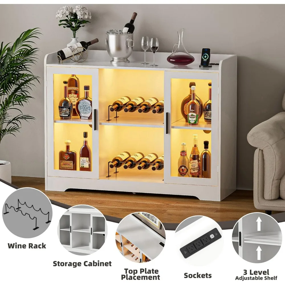 Wine Bar Cabinet with LED Lights, Modern Buffet Cabinet with Power Outlet, Wine& Glasses Liquor Cabinet for Home Kitchen Dining