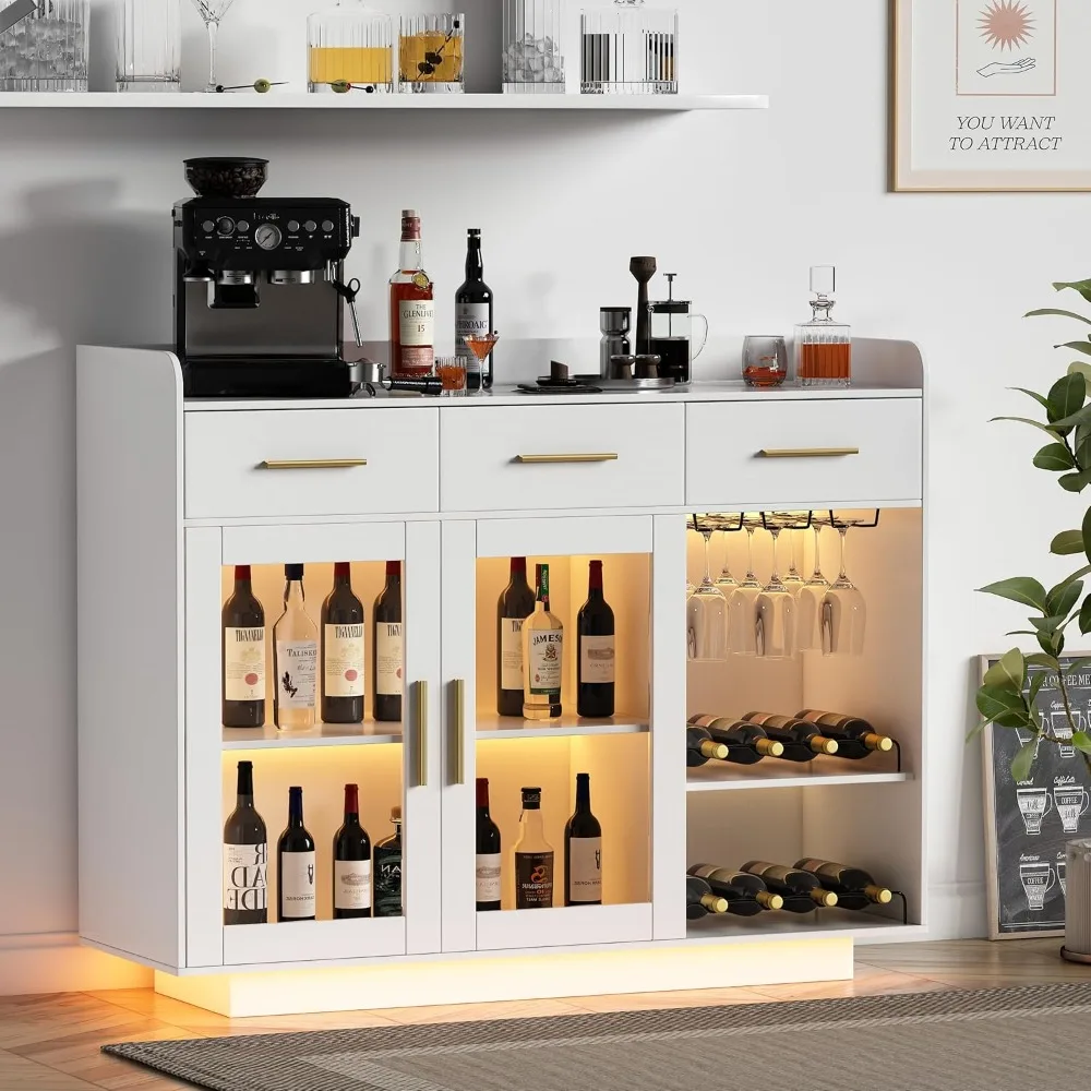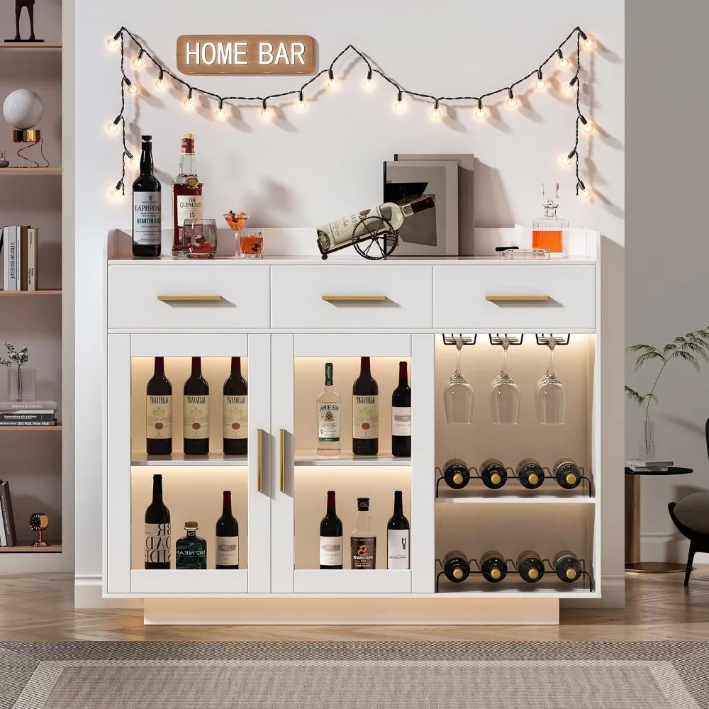 Wine Bar Cabinet with LED Strips,47.1″ with 3 Drawer and Power Outlet, Liquor Cabinet with 2 Adjustable Shelves and 2 Glass Door