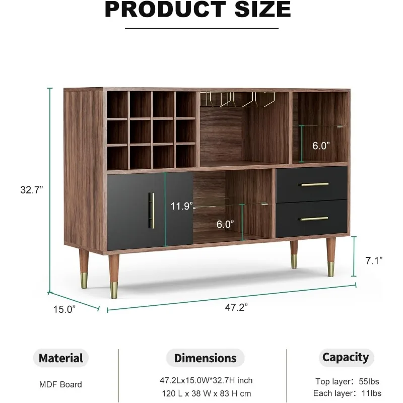 - Easy to Assemble: Item dimension: 47.2″W x 15″ D x 32.7″H. The home bar cabinet comes with a clear instructions. Additionally, each accessory is marked with its own code for easy identification and assembly