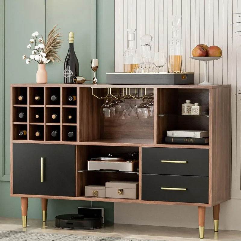 Wine Bar Cabinet with Storage, 47″ Kitchen Sideboard Buffet Cabinet with Wine Rack, Glass Holder and Drawers