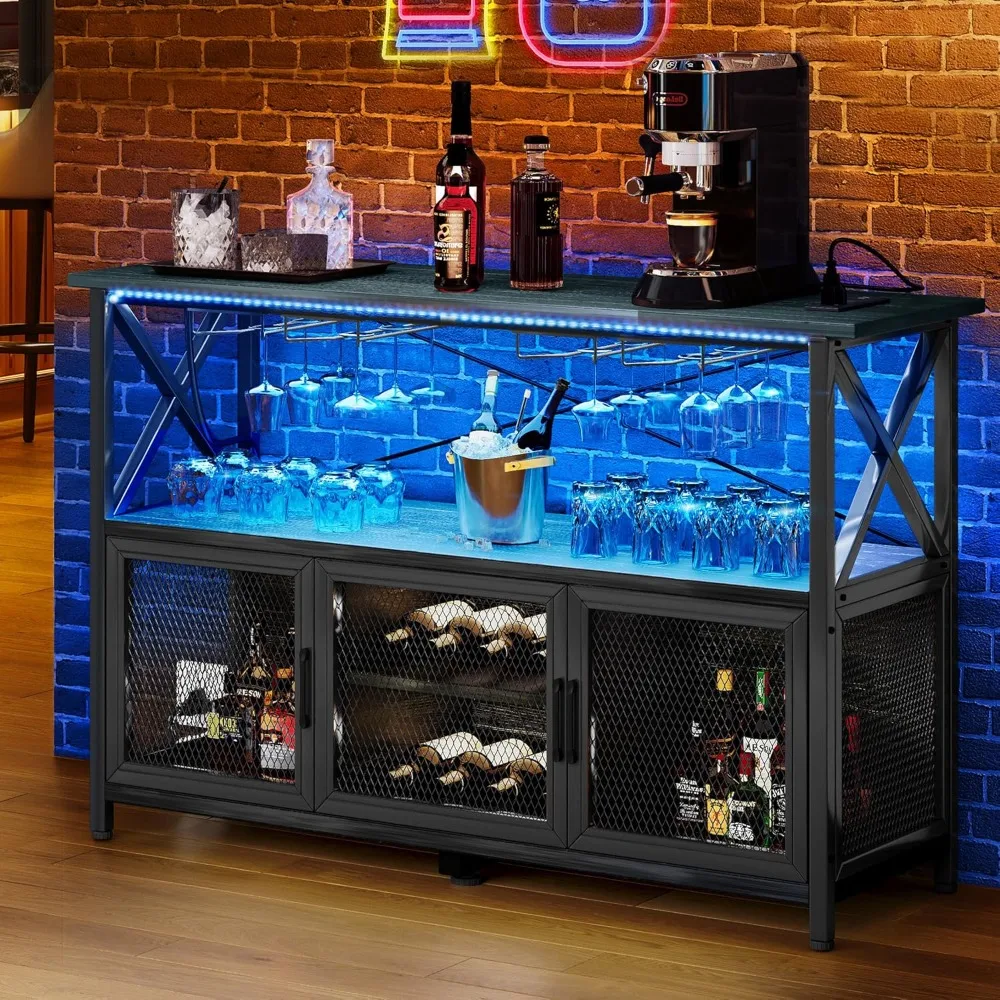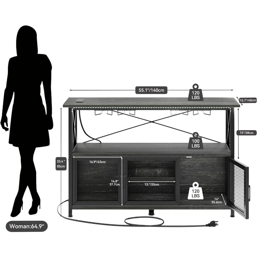 Wine Cabinet.55″ Bar Cabinet with LED Lights, Wine Cabinet with Power Outlet, Bar Table Stand with Wine Rack, Storage Cabinets,