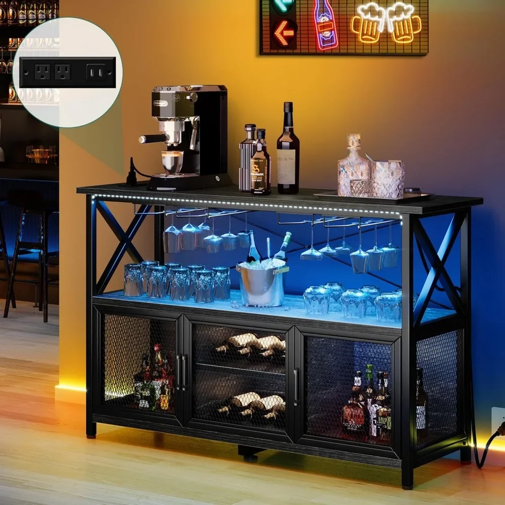 Wine Cabinet.55″ Bar Cabinet with LED Lights, Wine Cabinet with Power Outlet, Bar Table Stand with Wine Rack, Storage Cabinets,