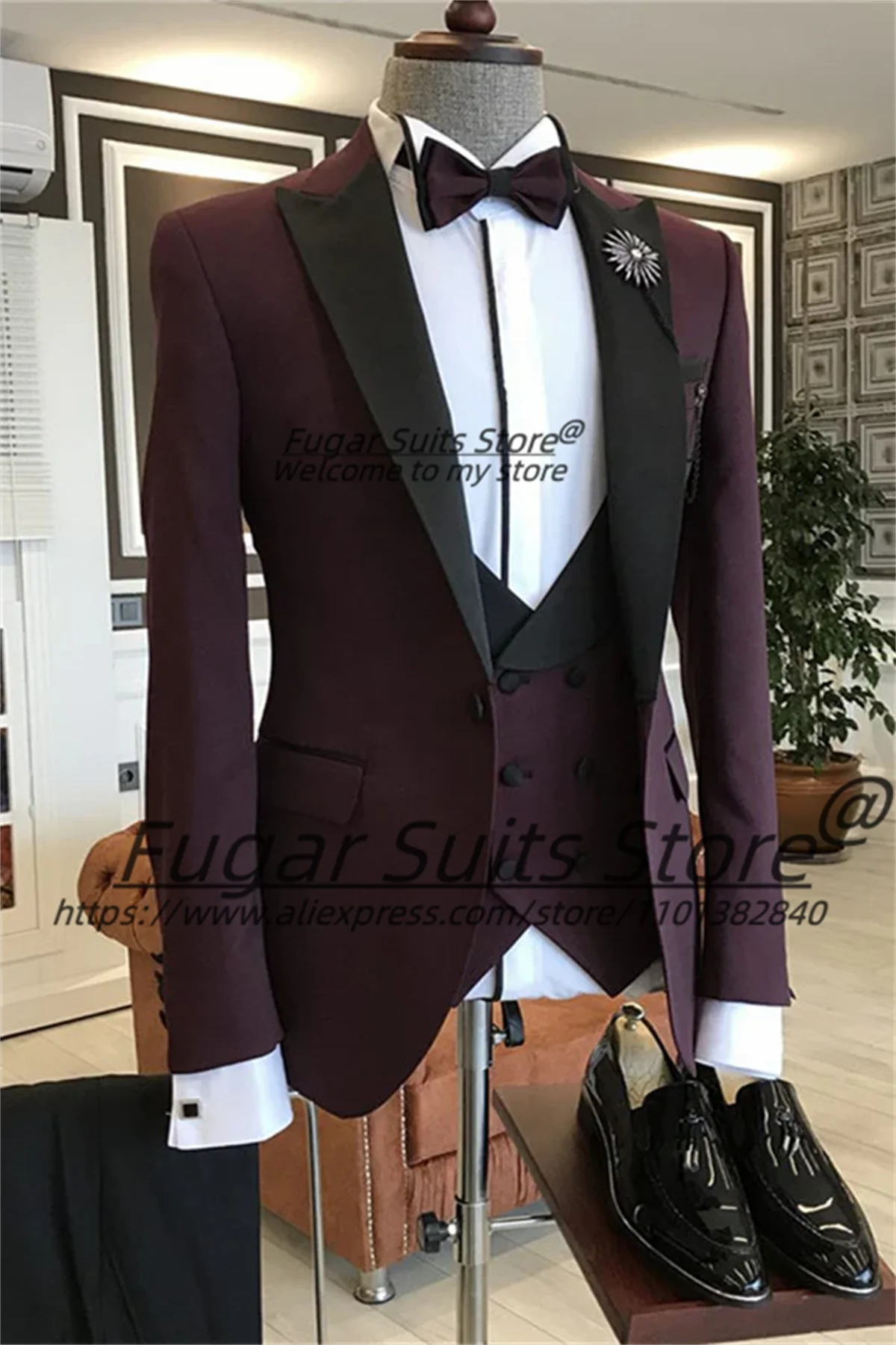 Wine Red Formal Wedding Suits For Men Slim Fit Peak Lapel Groom Party Tuxedos 3 Pieces Sets Business Male Blazers Ropa Hombre