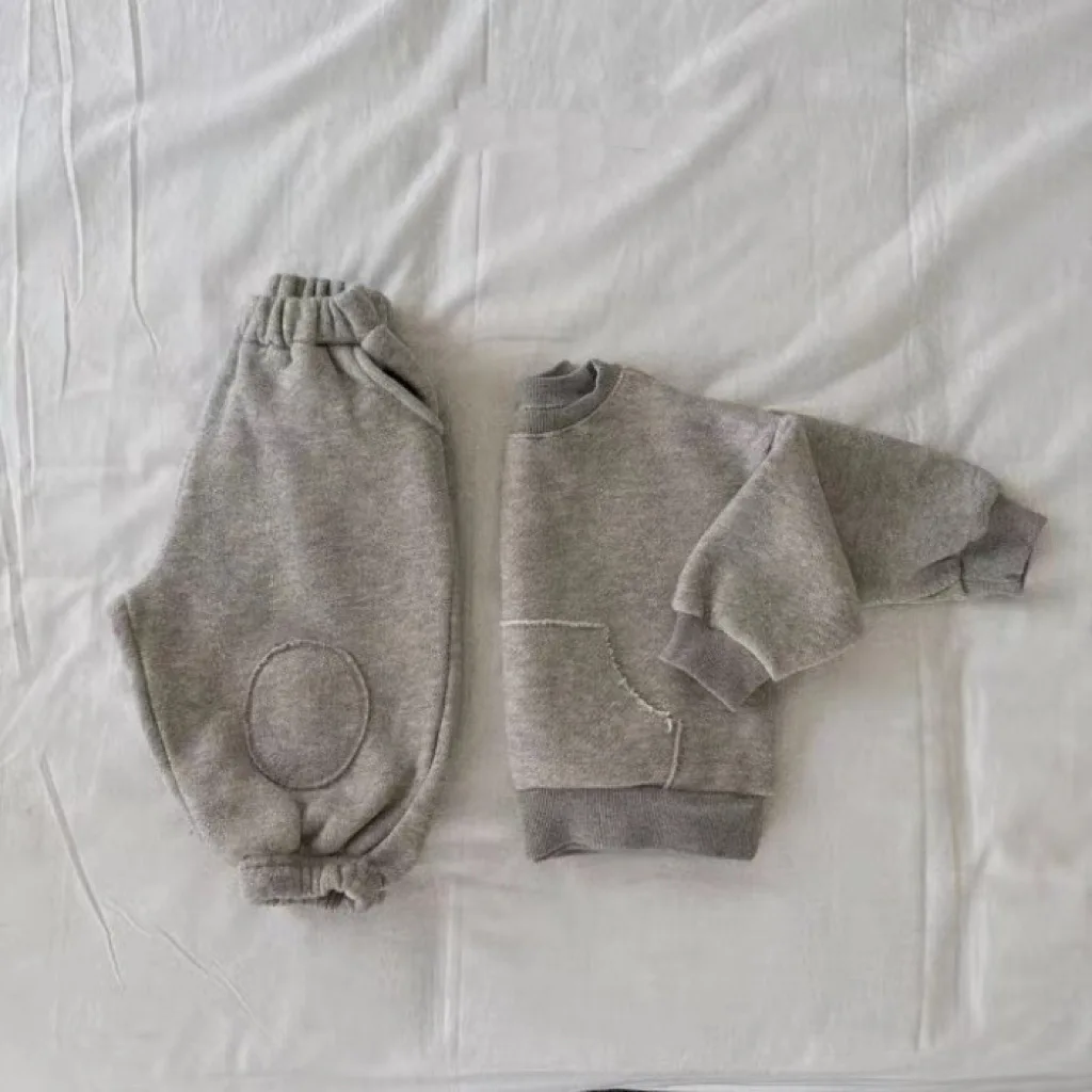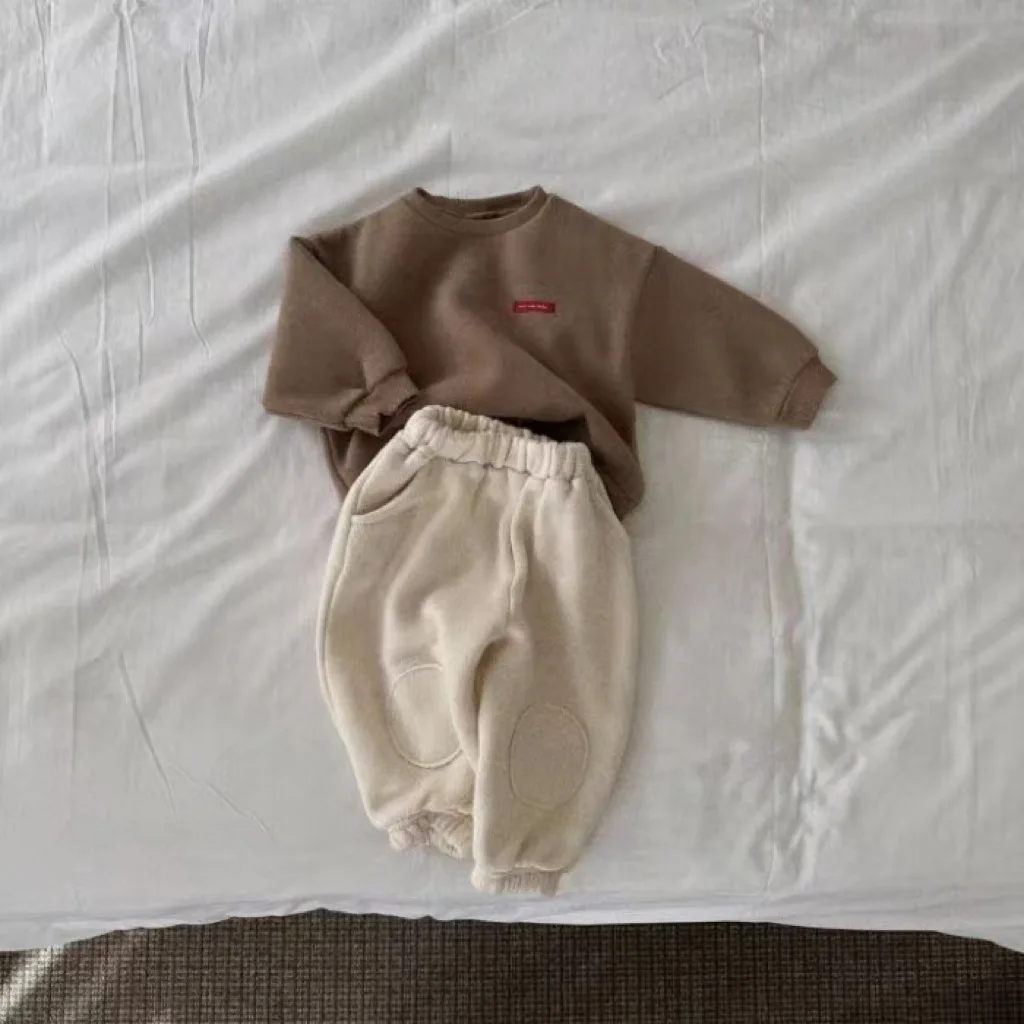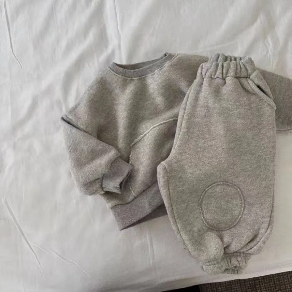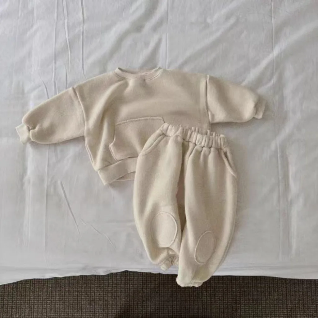 Winter Baby Fleece Sweatshirt Set Infant Boy Girl Solid Casual Tops + Patch Pants 2pcs Suit Plus Velvet Thick Kids Warm Outfits