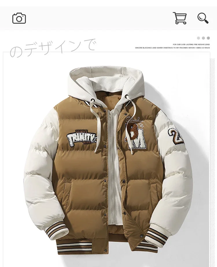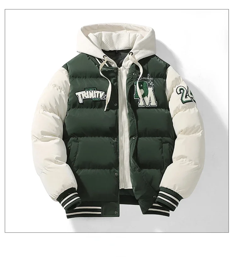 Winter Jacket Men’s Harajuku Fashion Embroidered Fake Two-Piece Hooded Warm Parka Men Streetwear Loose Thickened Padded Jacket