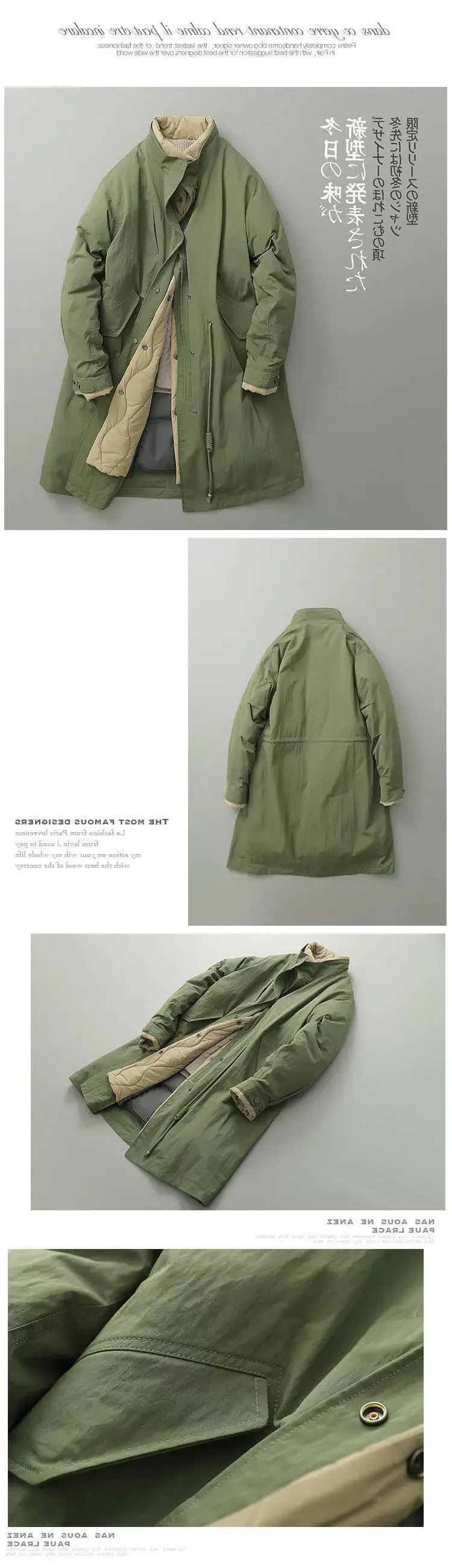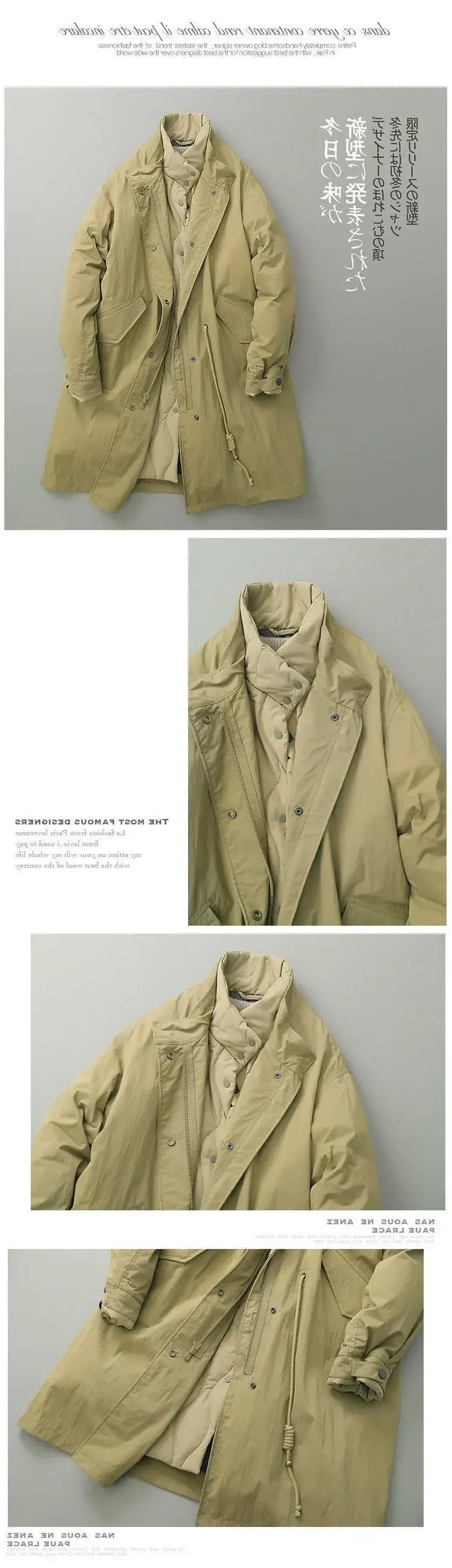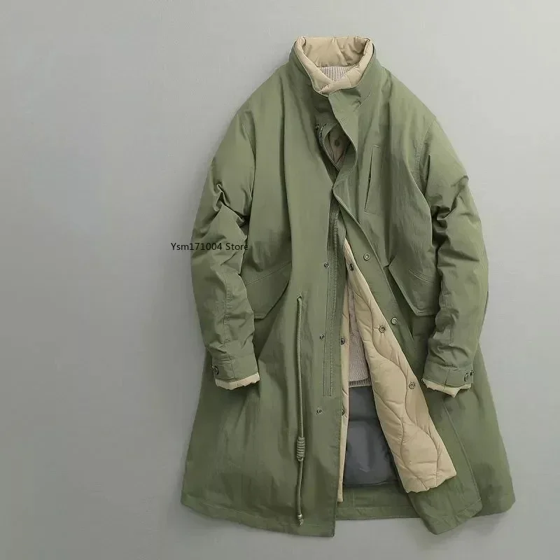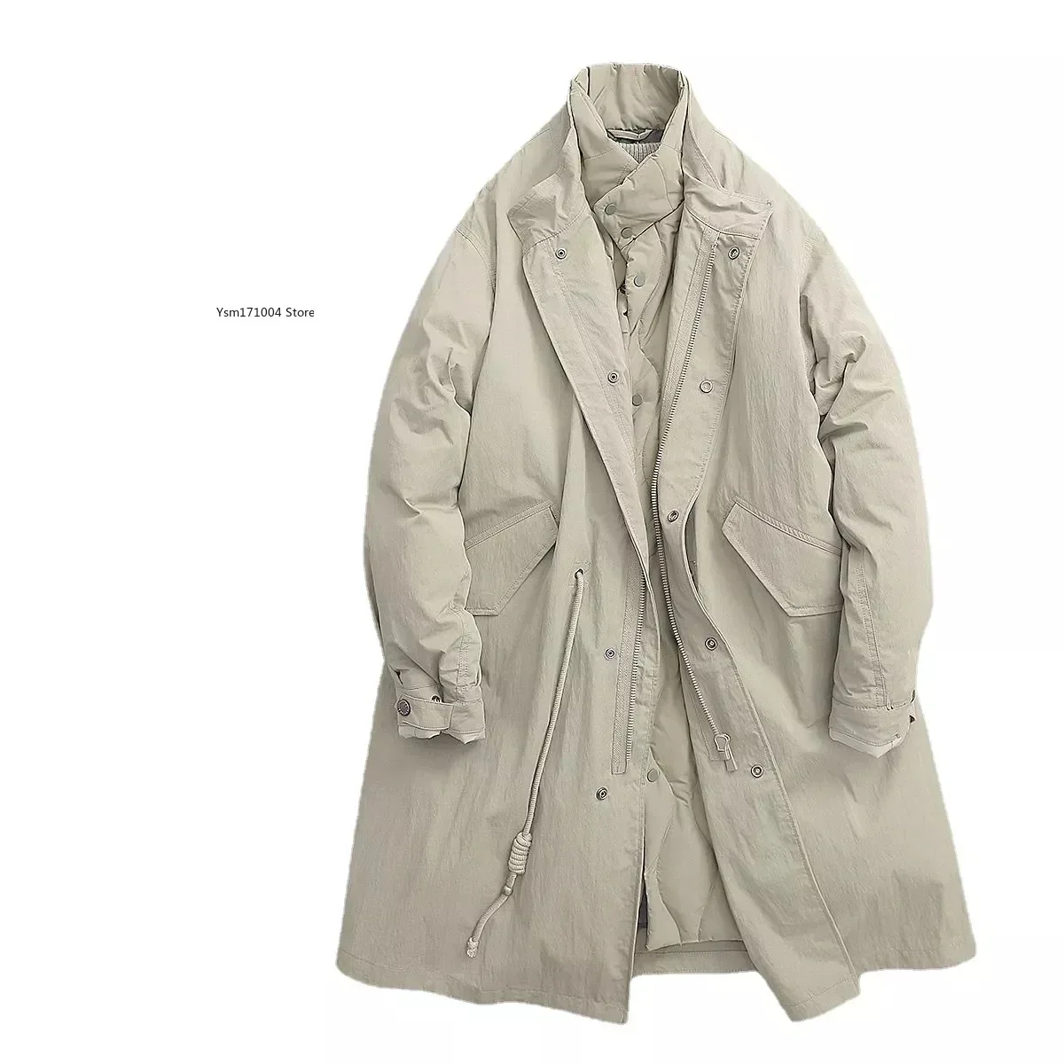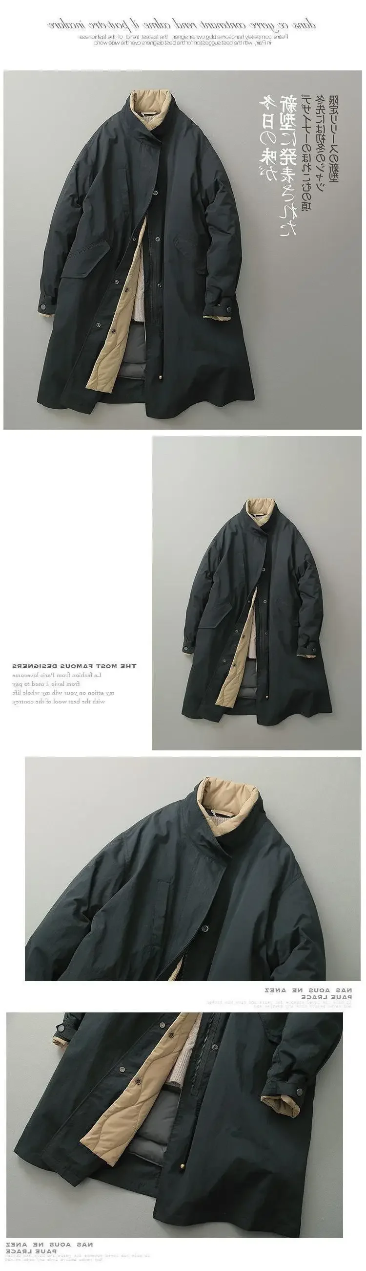 Winter Mens Jacket Japan Harajuku Retro Fake Two-piece Cotton Set Oversized Solid Color Jacket Standing Collar Long Cotton Coats
