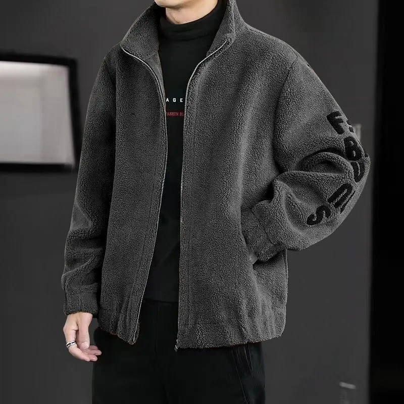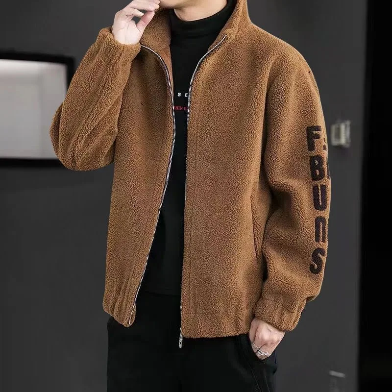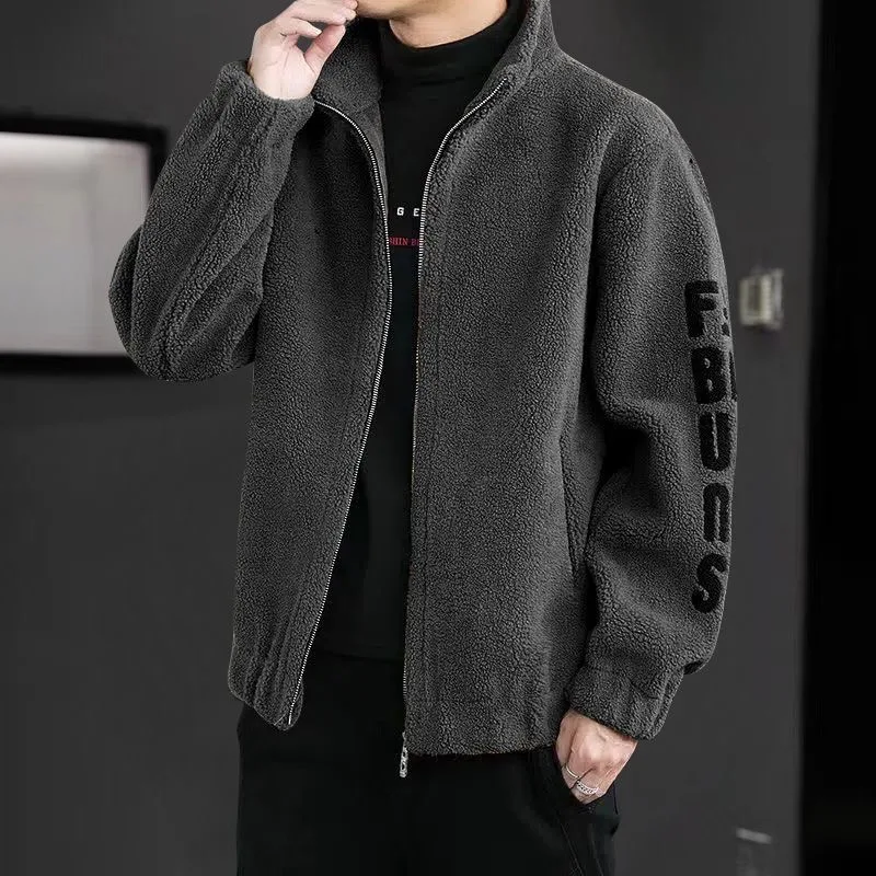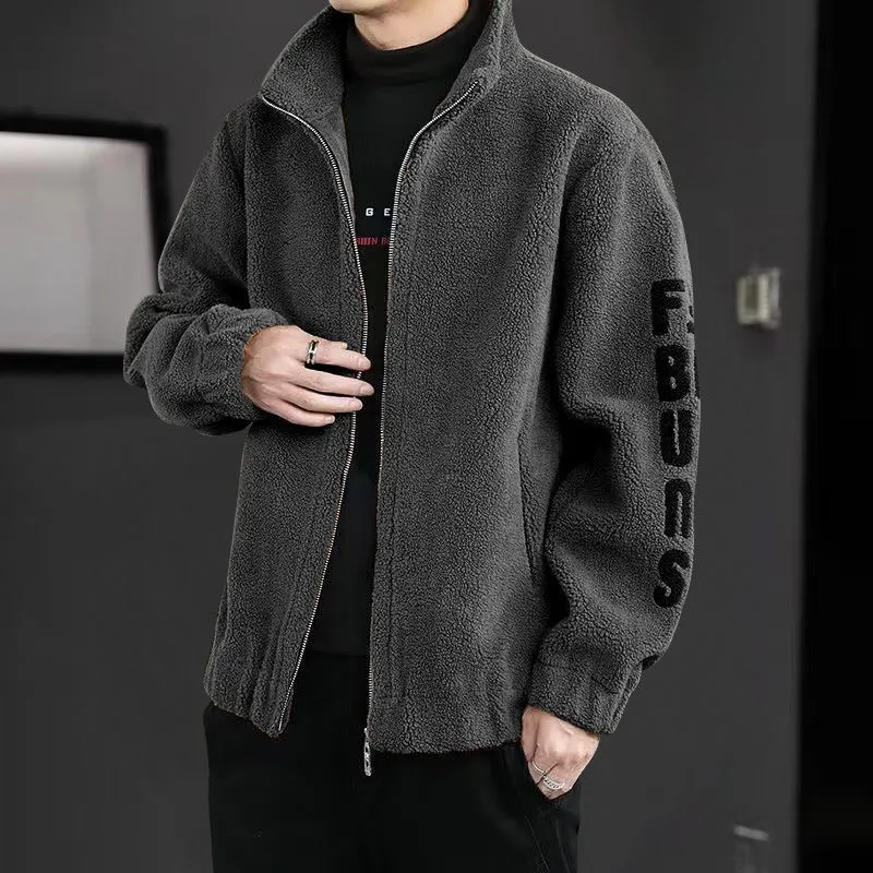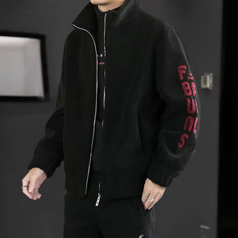 Winter Zipper Casual Coat For Men Pokcet Fashion Warm Fleece Letter Printed Korean Stand Collar Outwear Men Clothing