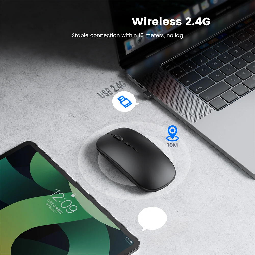 3.Plug and Play:No need to install any drivers, just plug the USB receiver into your laptop, and the mouse can start using it. 2.4 GHz wireless technology provides powerful and reliable connectivity, with an effective range of up to 10 meters.