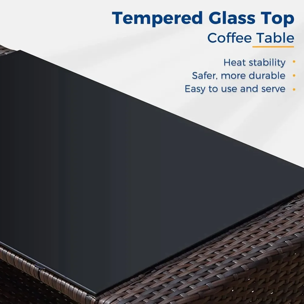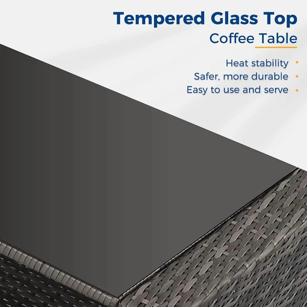 - 【Easy to Maintain】Cleaning and maintaining this patio furniture set is a breeze. The cushion covers can be easily removed with the zipper design, allowing for convenient cleaning. The splash-proof material ensures hassle-free maintenance. Additionally, the tempered glass top of the coffee table can be cleaned by simply soaking a towel in fresh water. For tough stains, soak the towel in water at 100°F for effective cleaning.