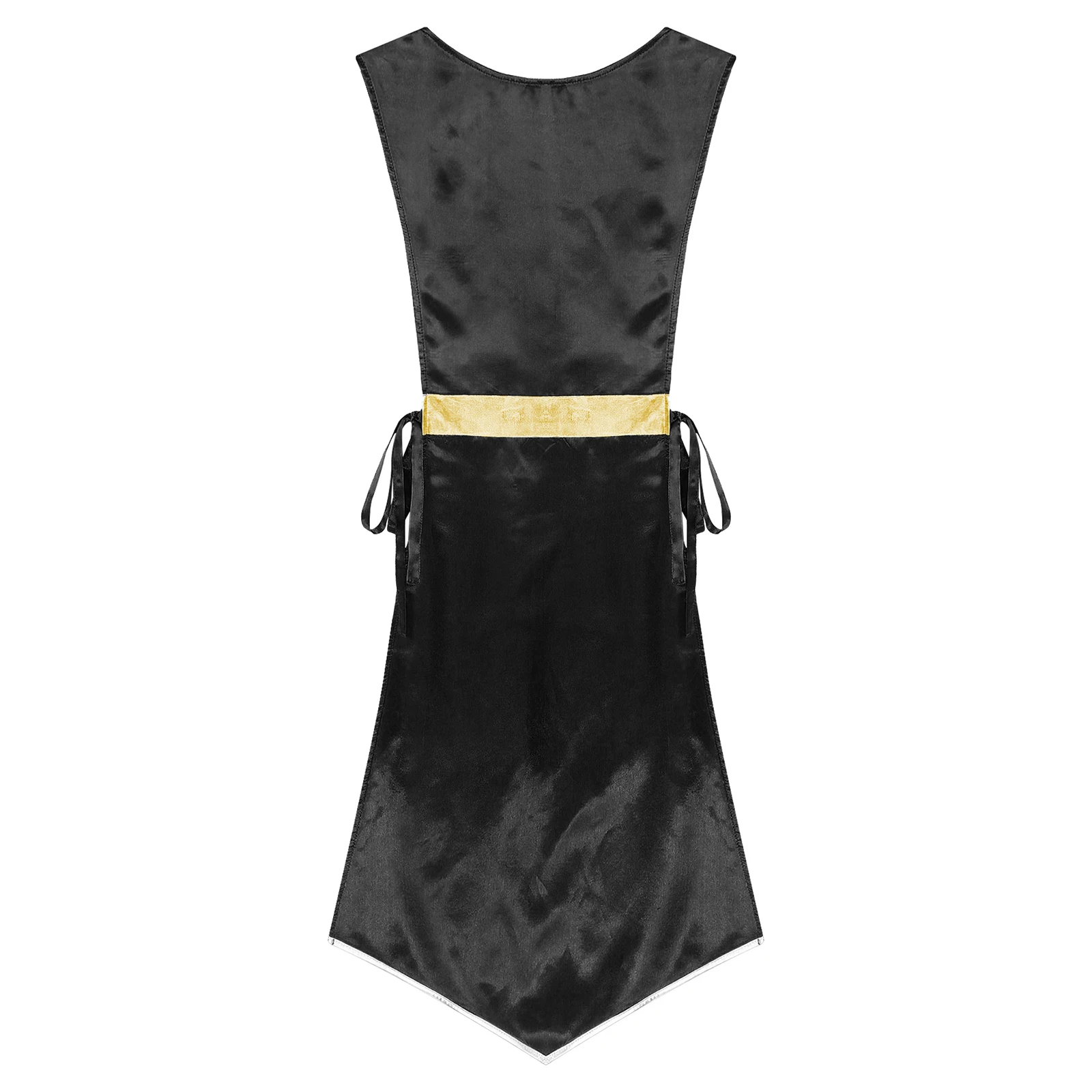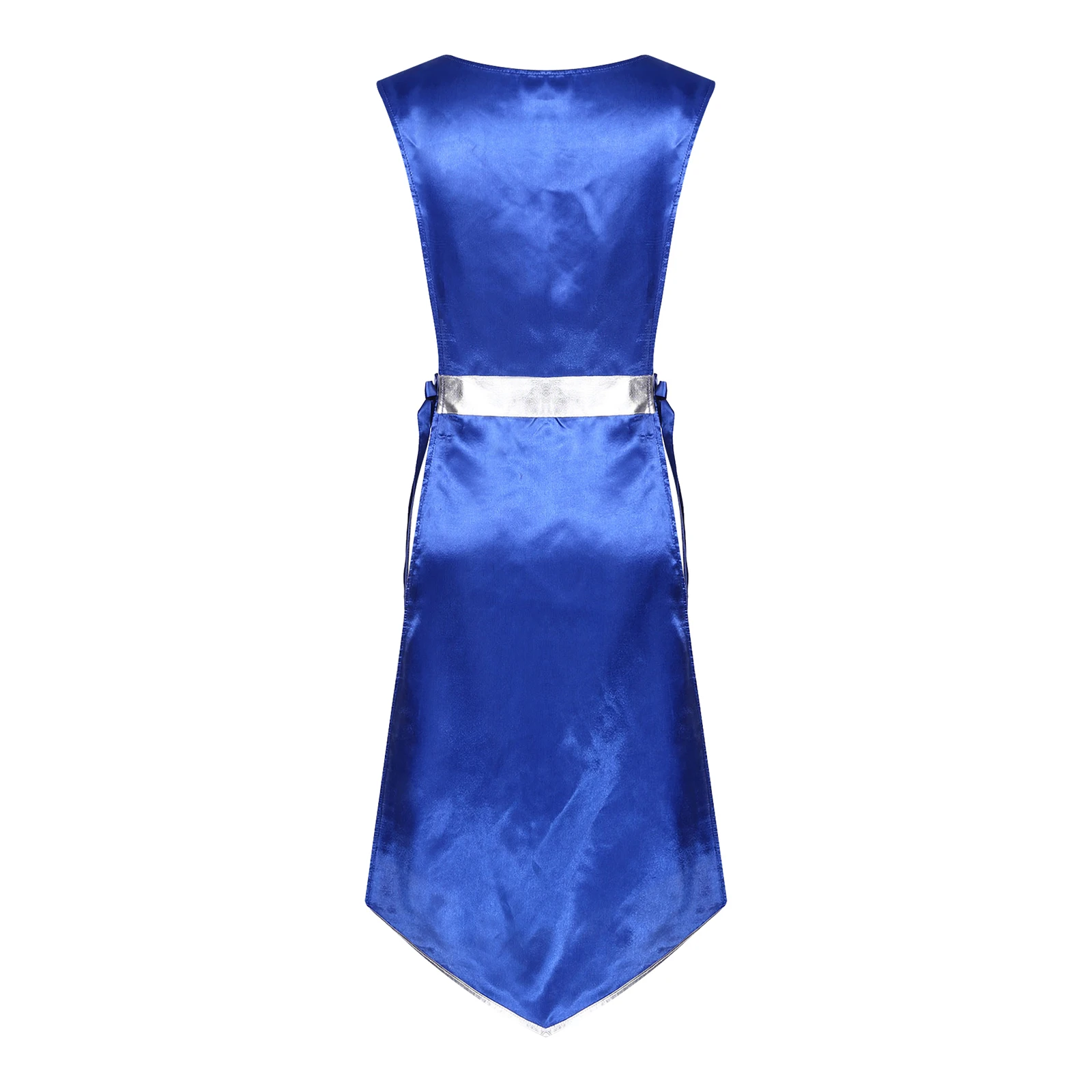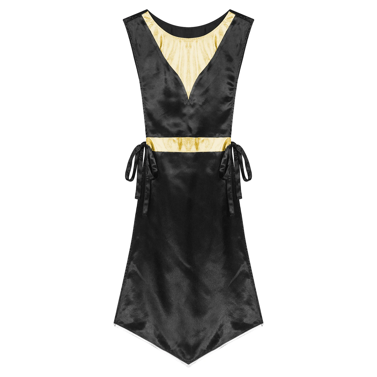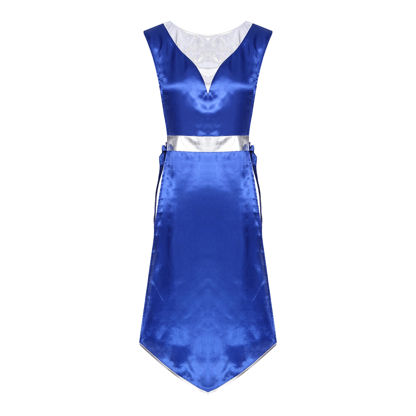 Metallic gloss fabric patchwork design at the neckline and the waist makes it look like a V-neck and highlights the waistline.