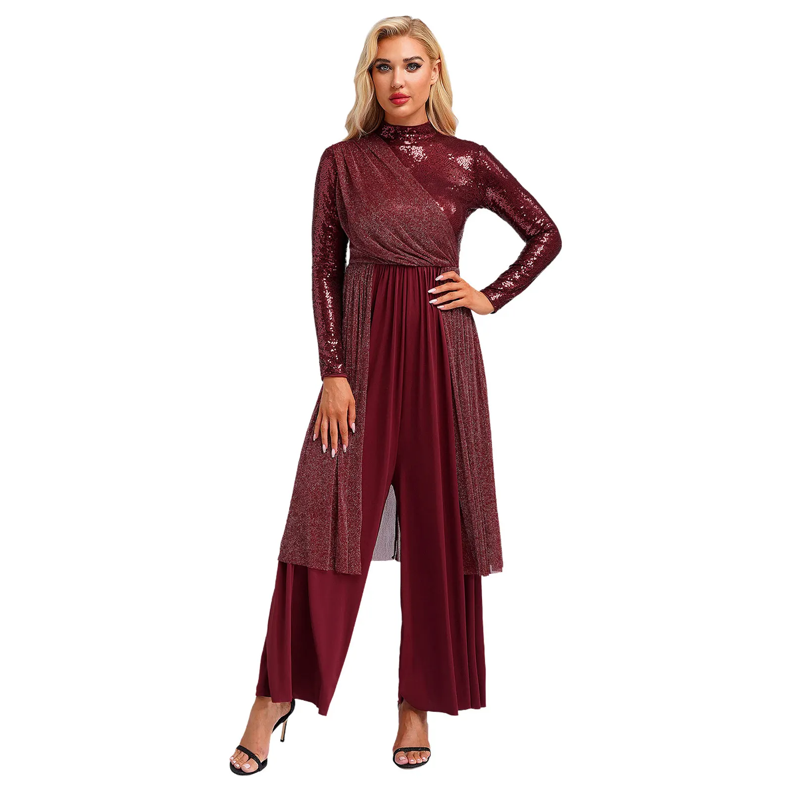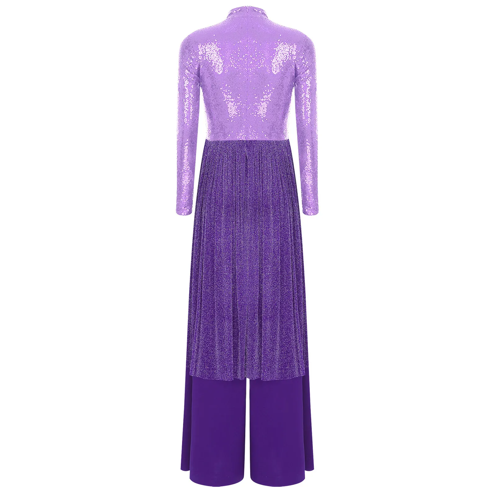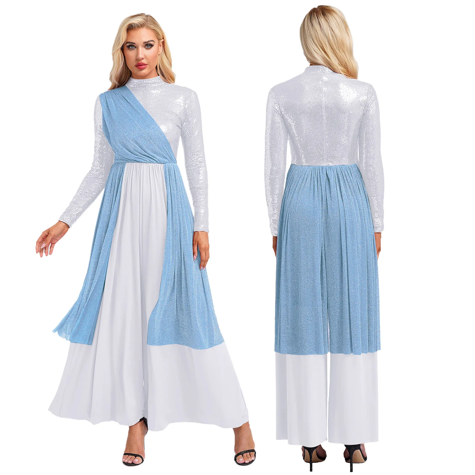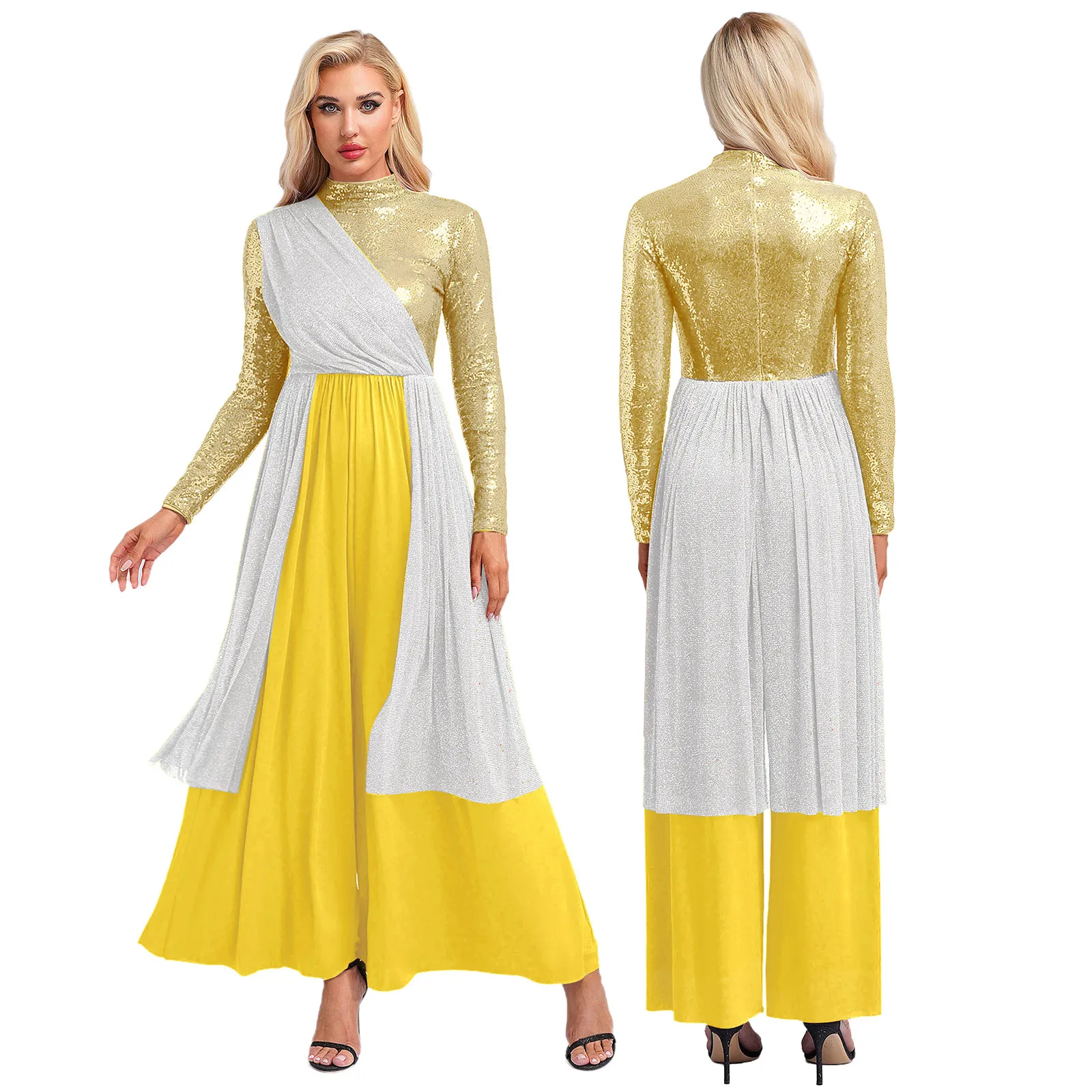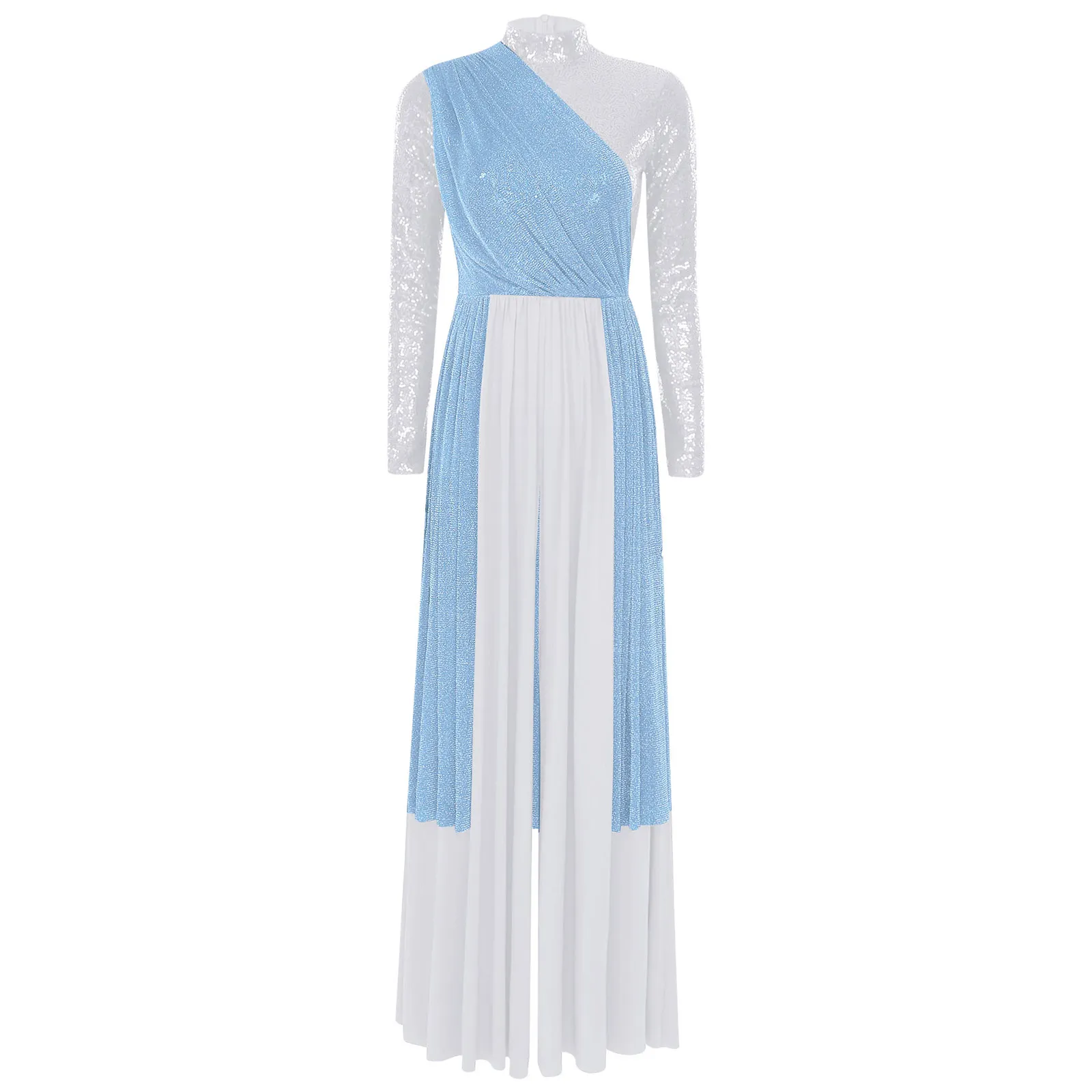 Women Church Choir Worship Liturgical Jumpsuit Praise Modern Lyrical Dance Costume Long Sleeve Sequin Shiny Overlay Catsuit