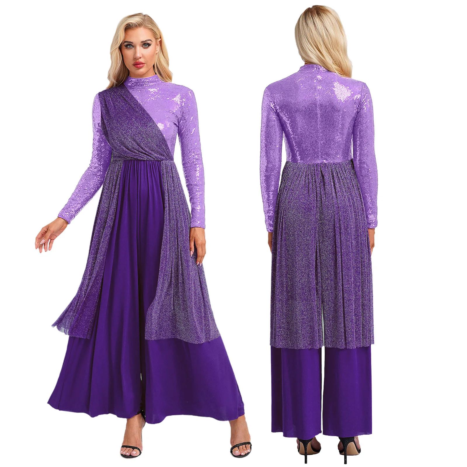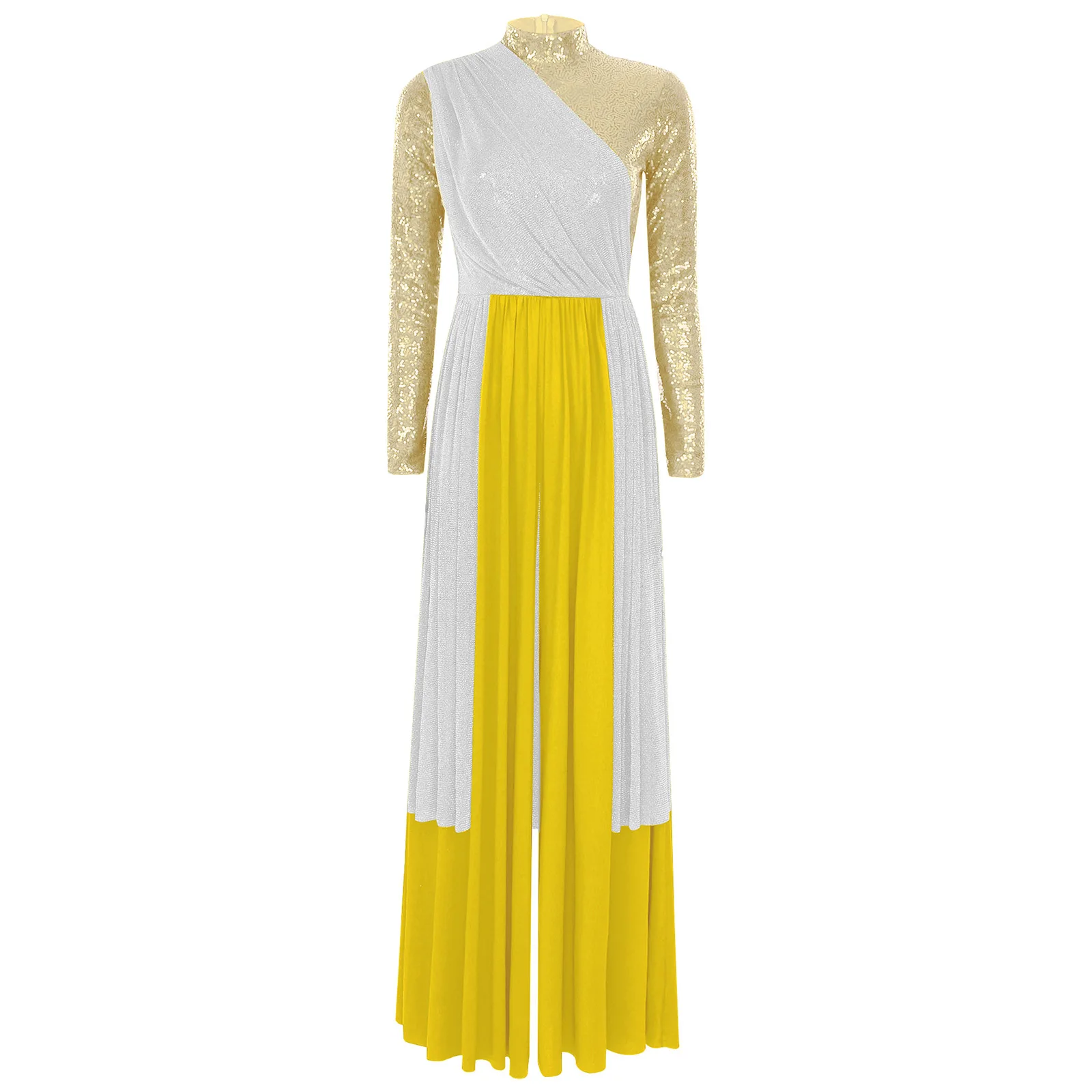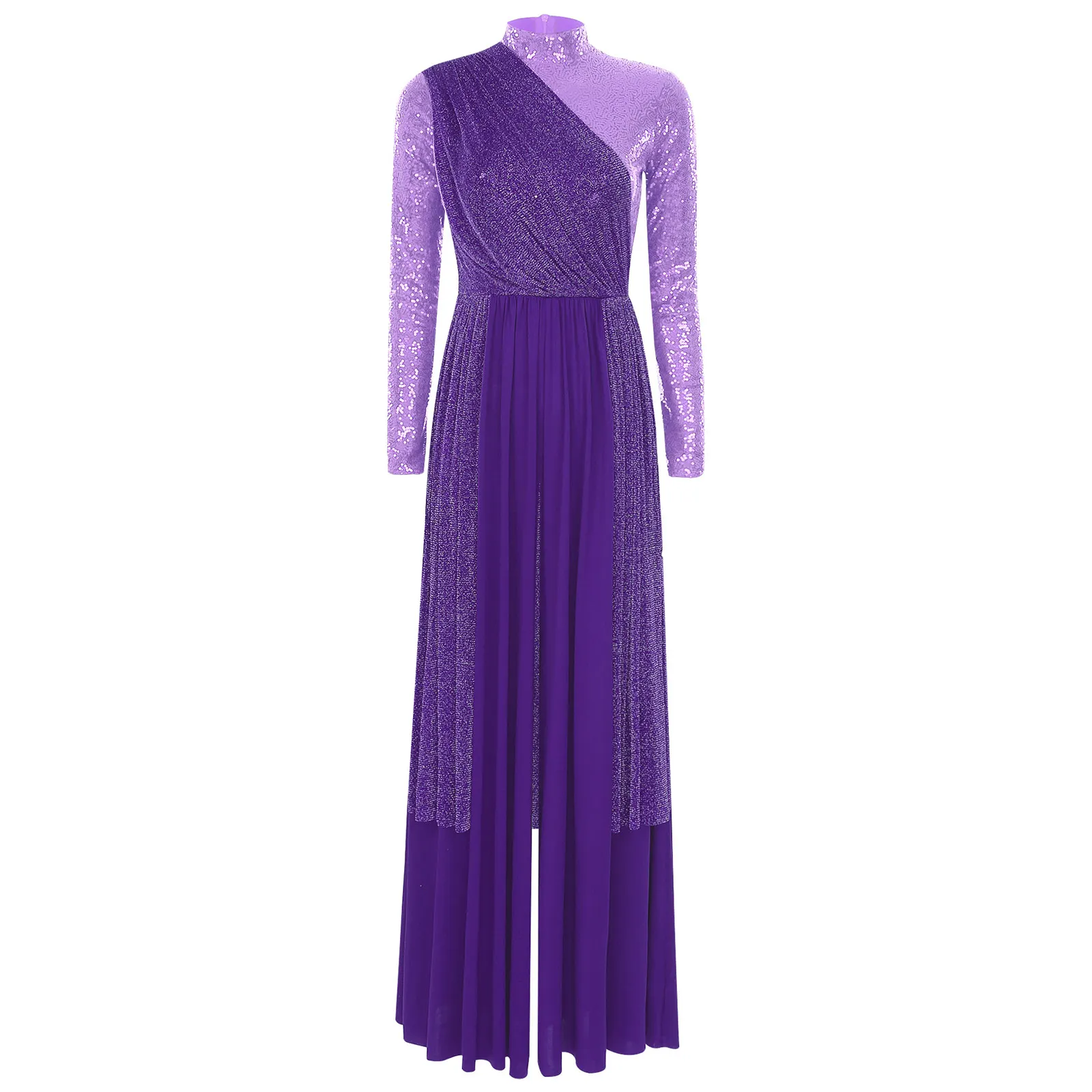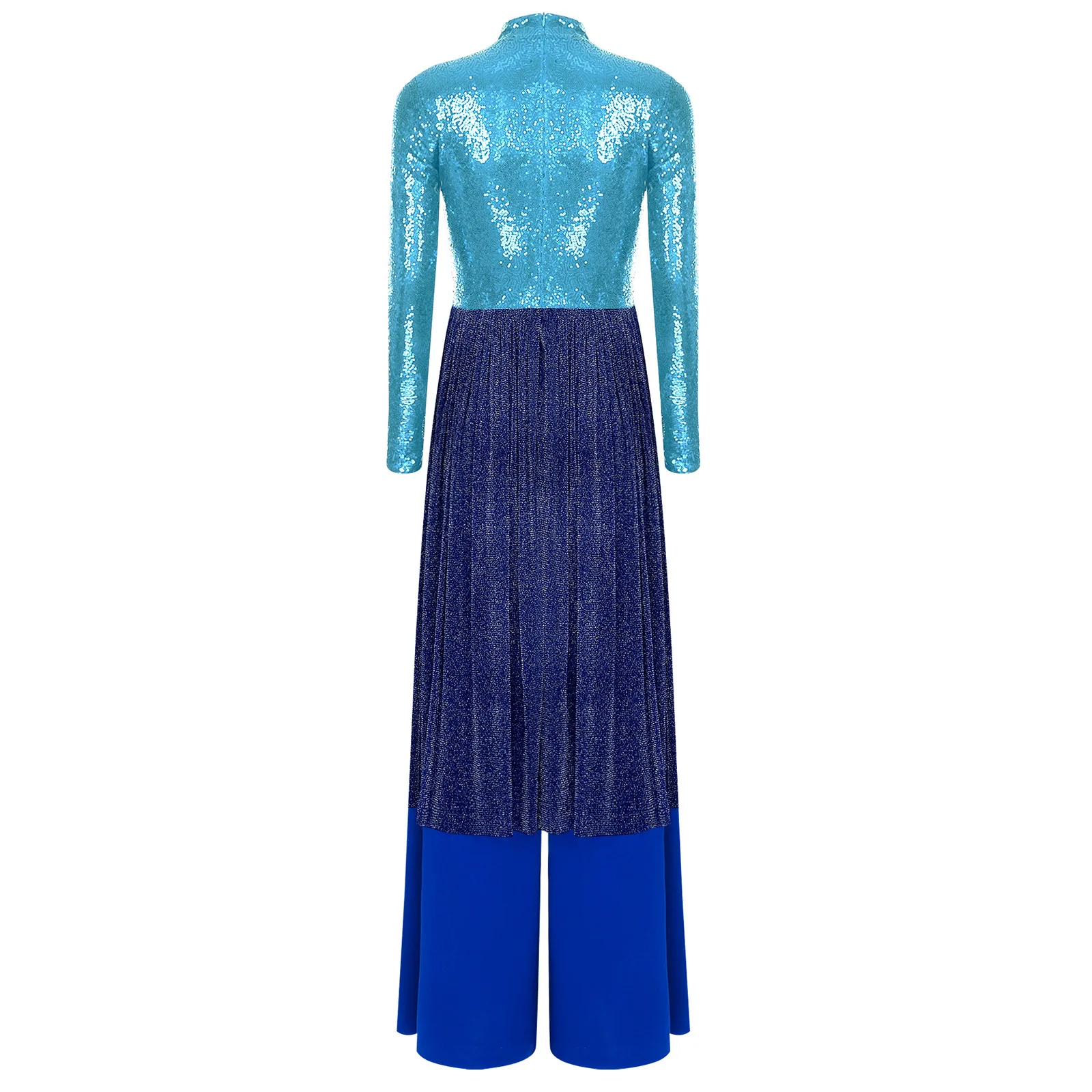 Women Church Choir Worship Liturgical Jumpsuit Praise Modern Lyrical Dance Costume Long Sleeve Sequin Shiny Overlay Catsuit