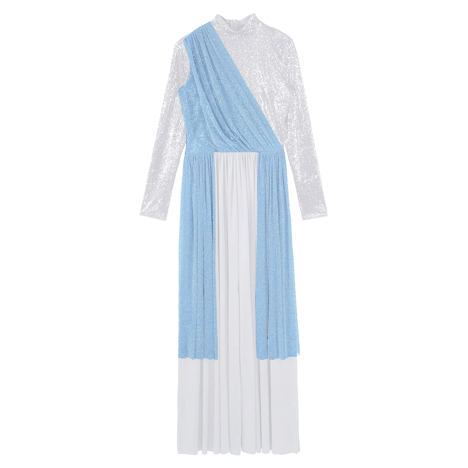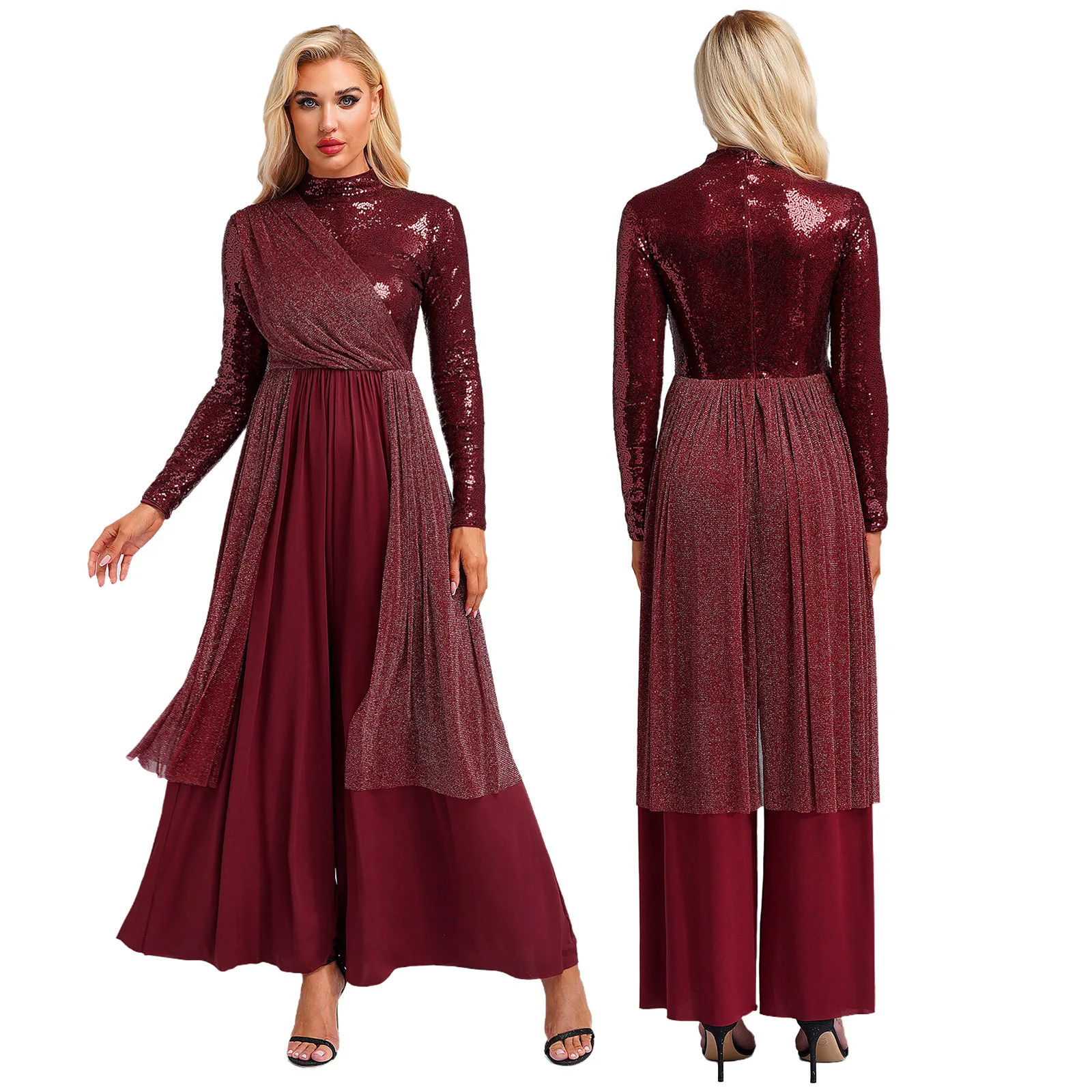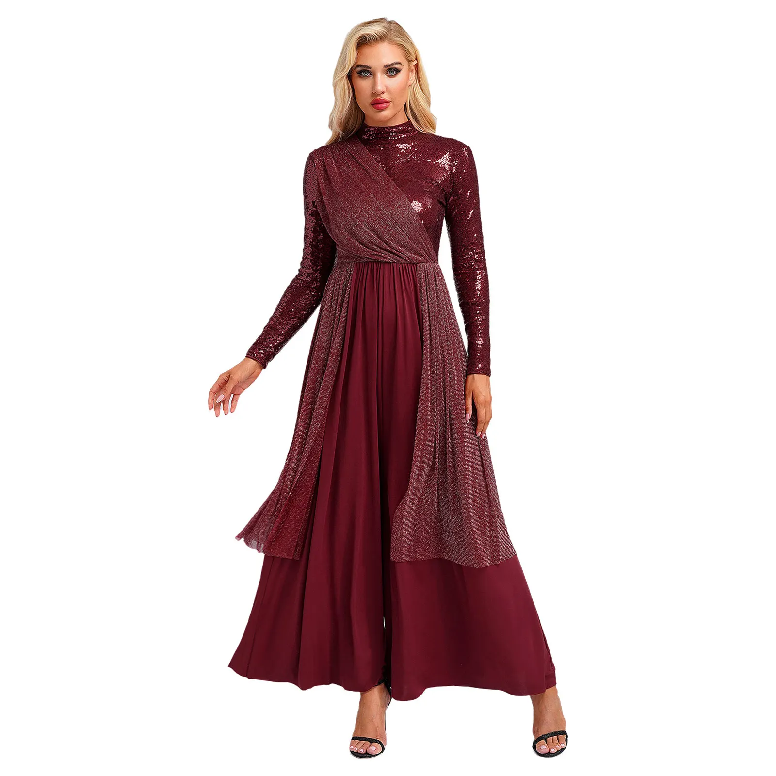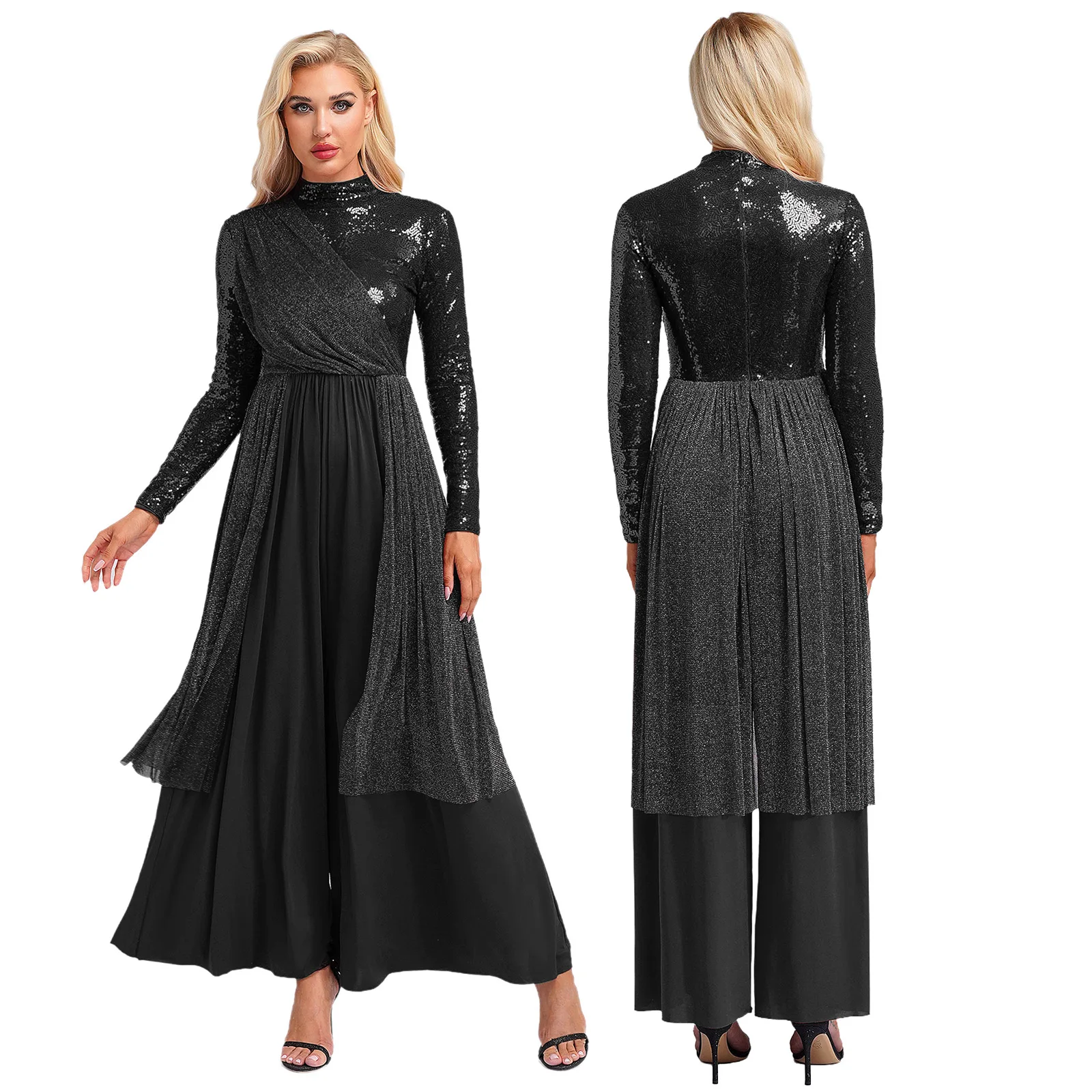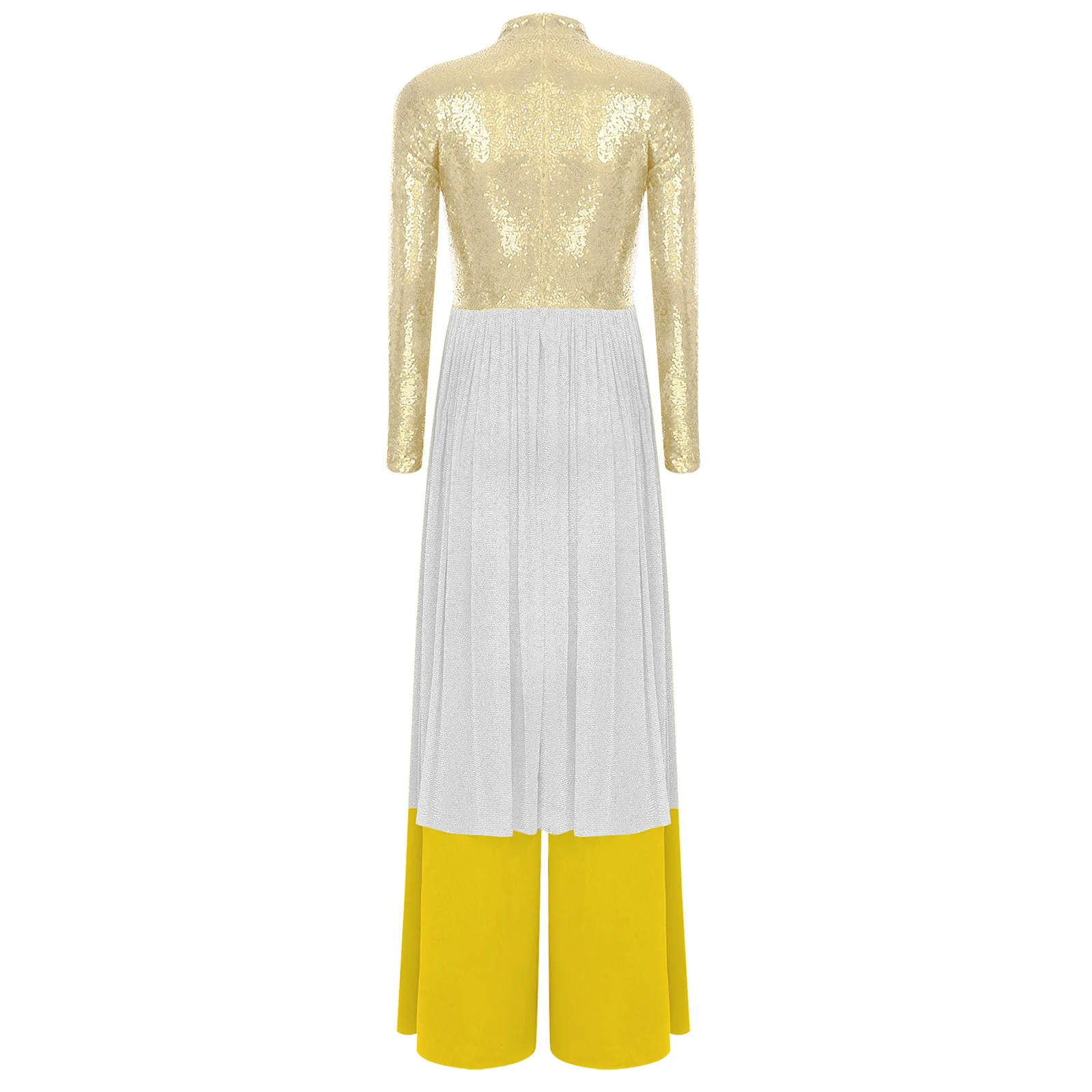 Women Church Choir Worship Liturgical Jumpsuit Praise Modern Lyrical Dance Costume Long Sleeve Sequin Shiny Overlay Catsuit