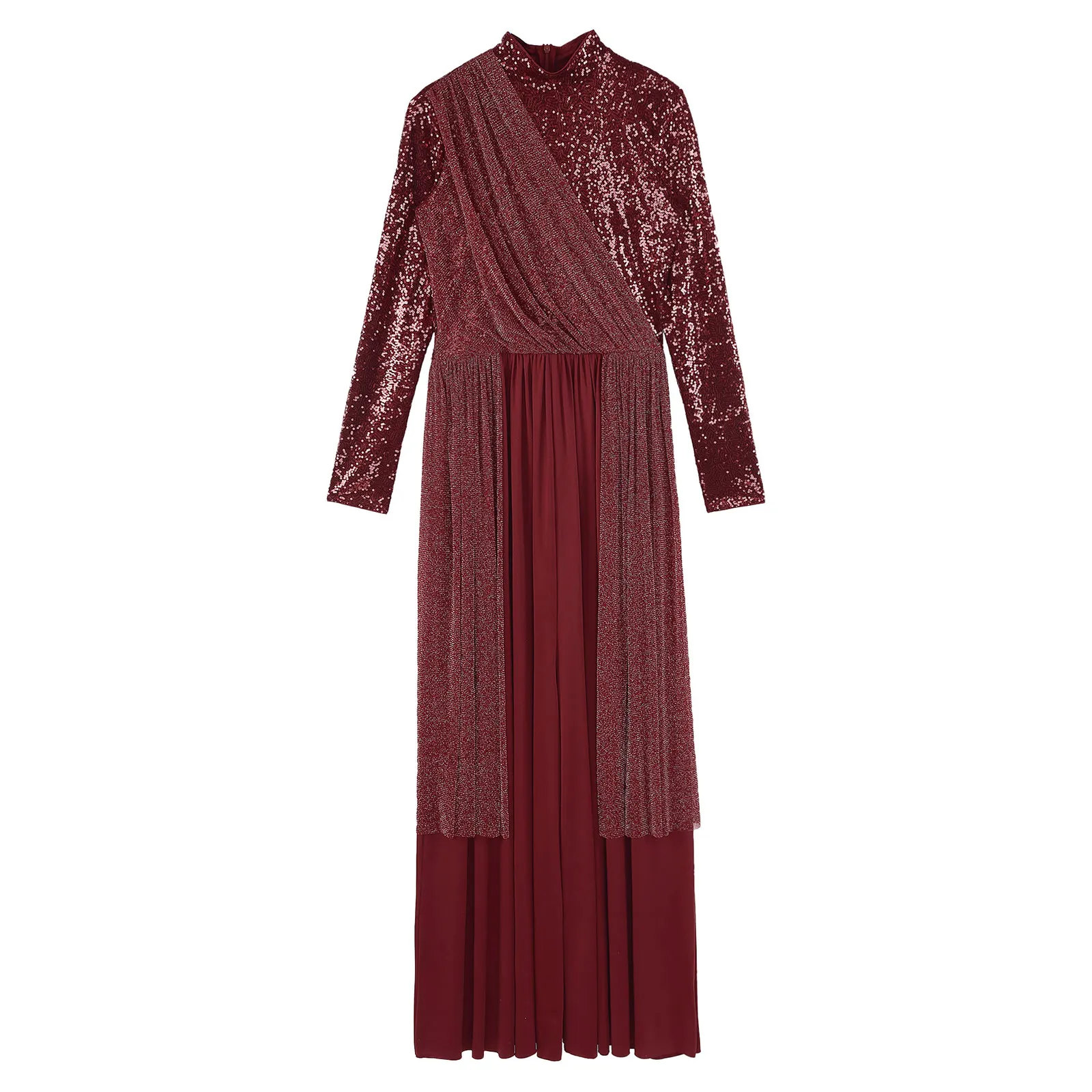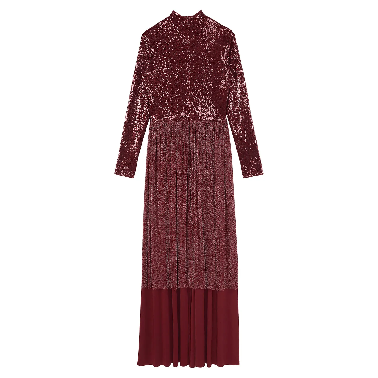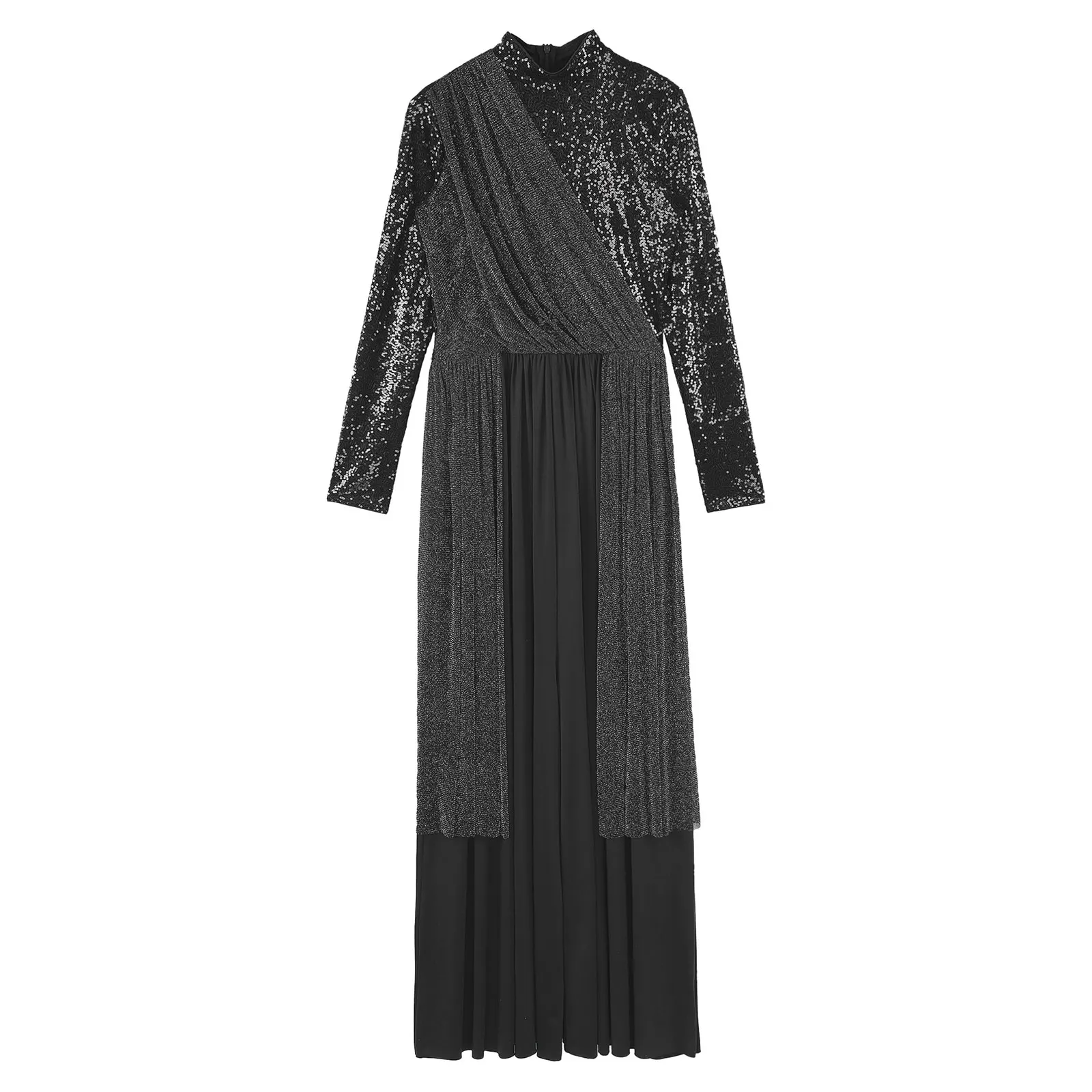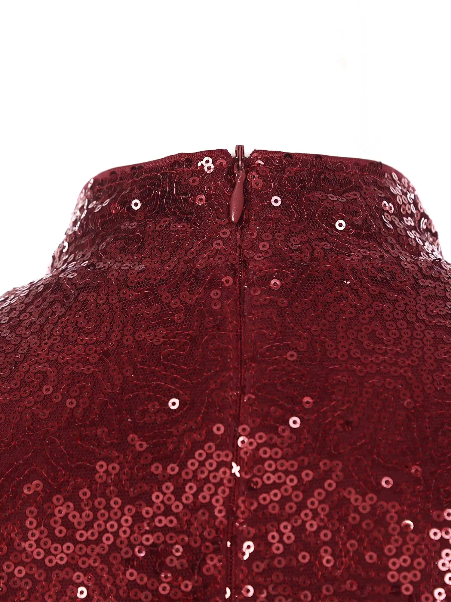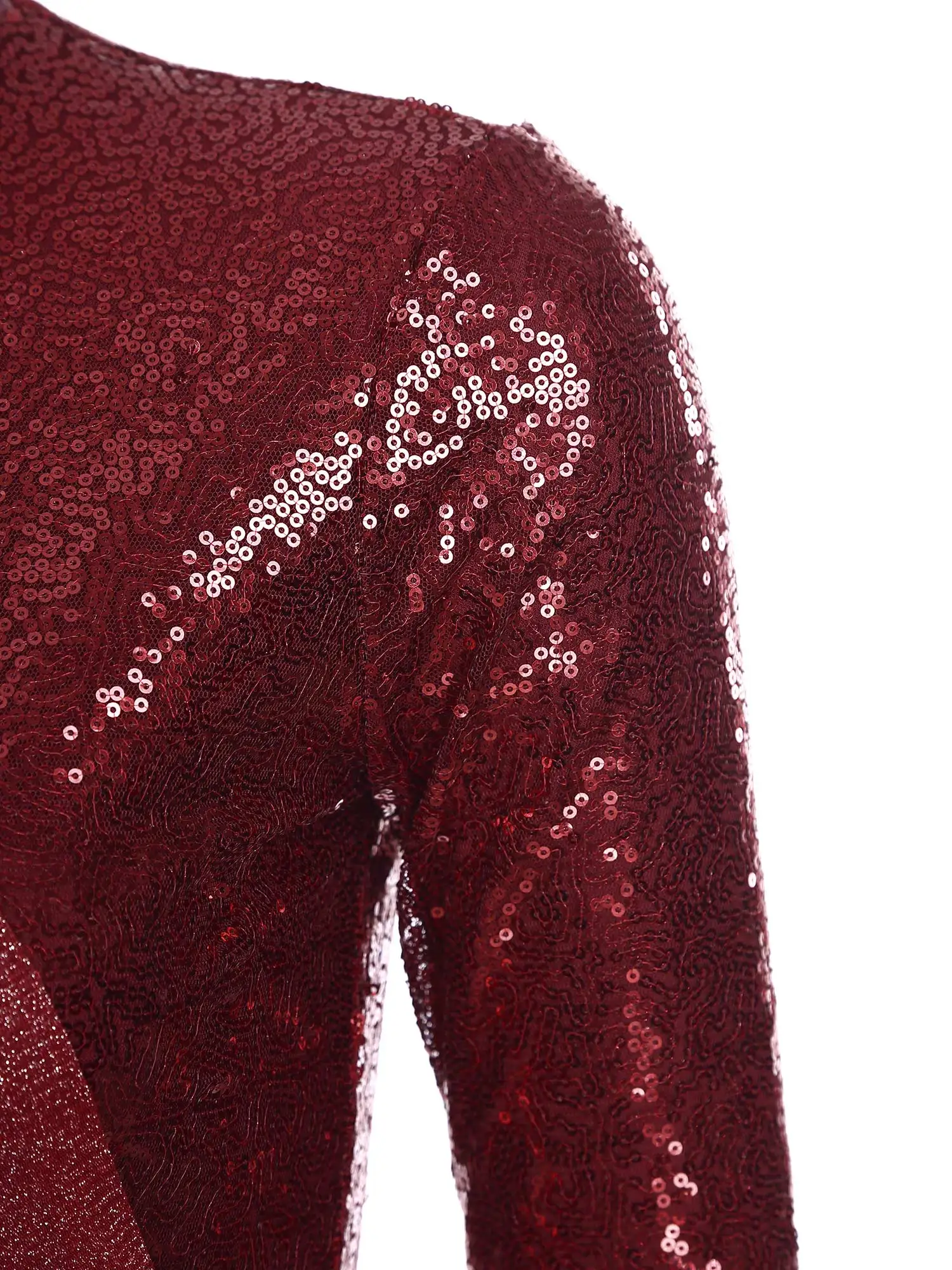 Long sleeve, mock neckline dance jumpsuit is designed with shiny sequin top bodice, inner with lining.