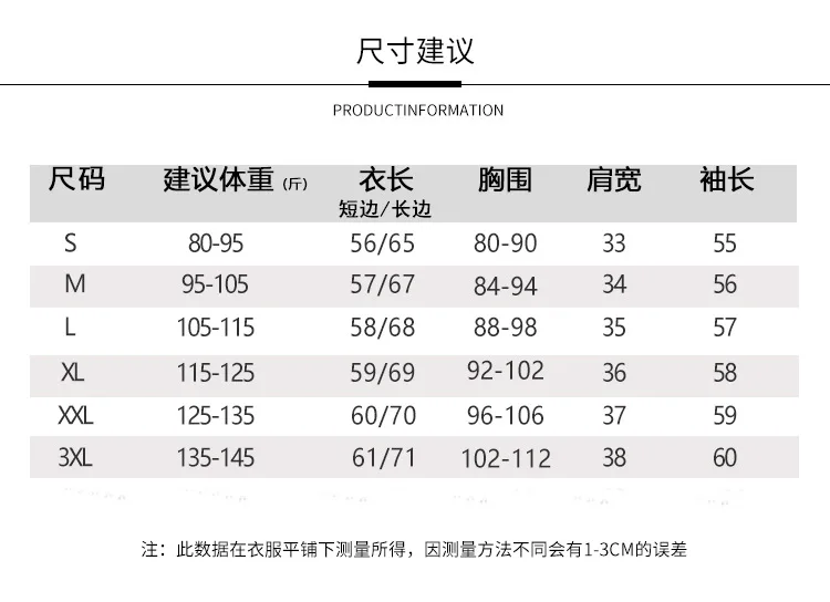 Size XXXL Length:61/71cm  Chest:102-112cm Sleeve:60cm  Shoulder:38cm  Weight:67.5kgs-72.5kgs