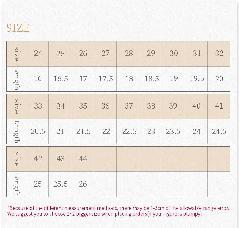 Tips: the size chart is just for your reference.Normally, one bigger size means extra 0.5cm.