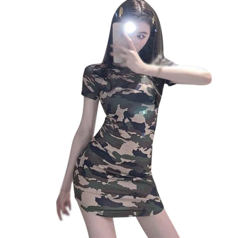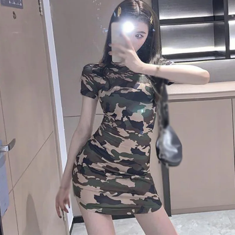 Women Korean O Neck Camouflage Slim Casual Sports Short Sleeve Dresses