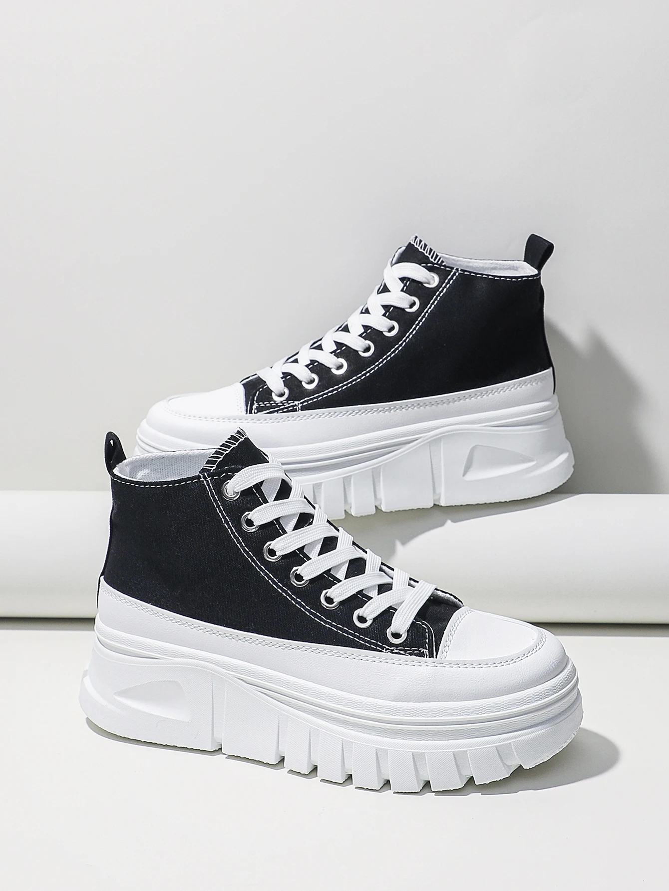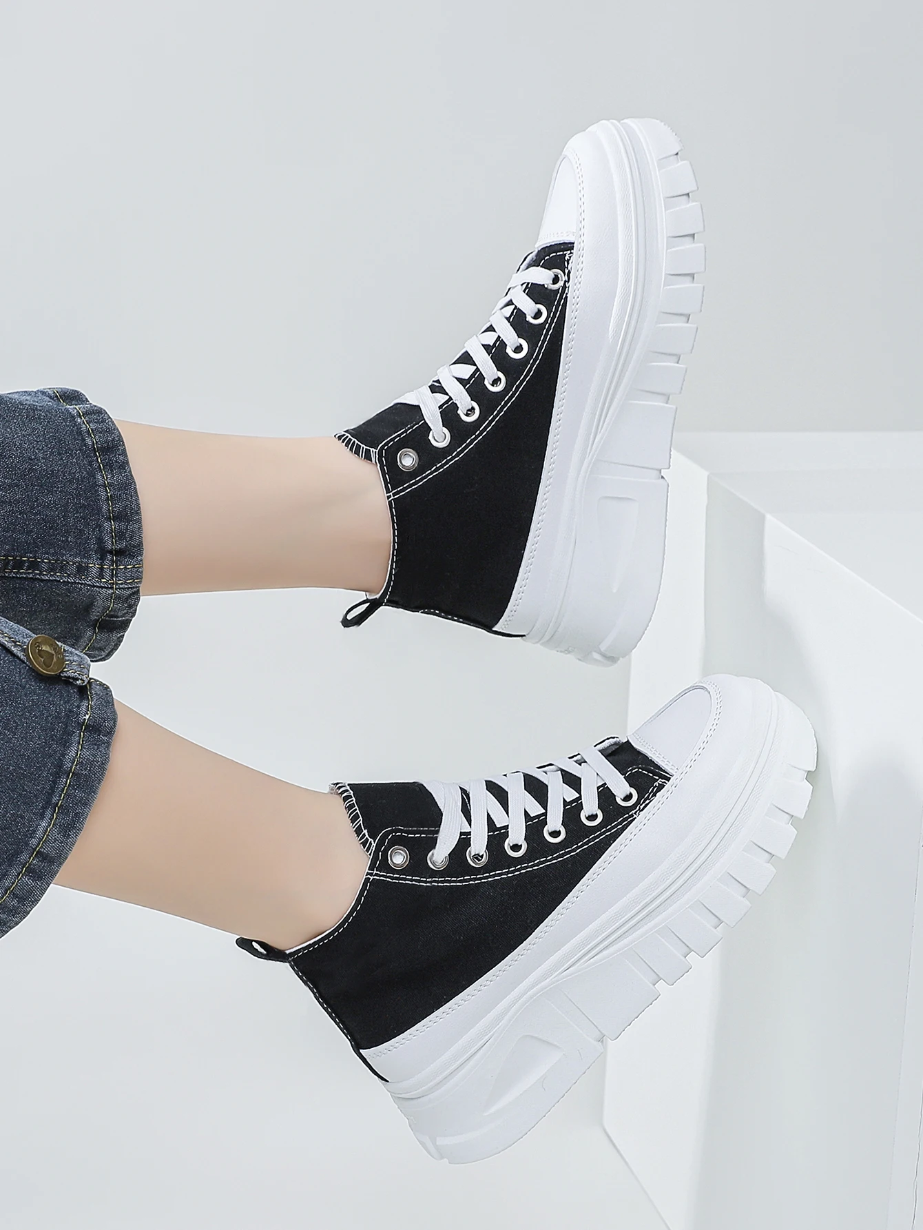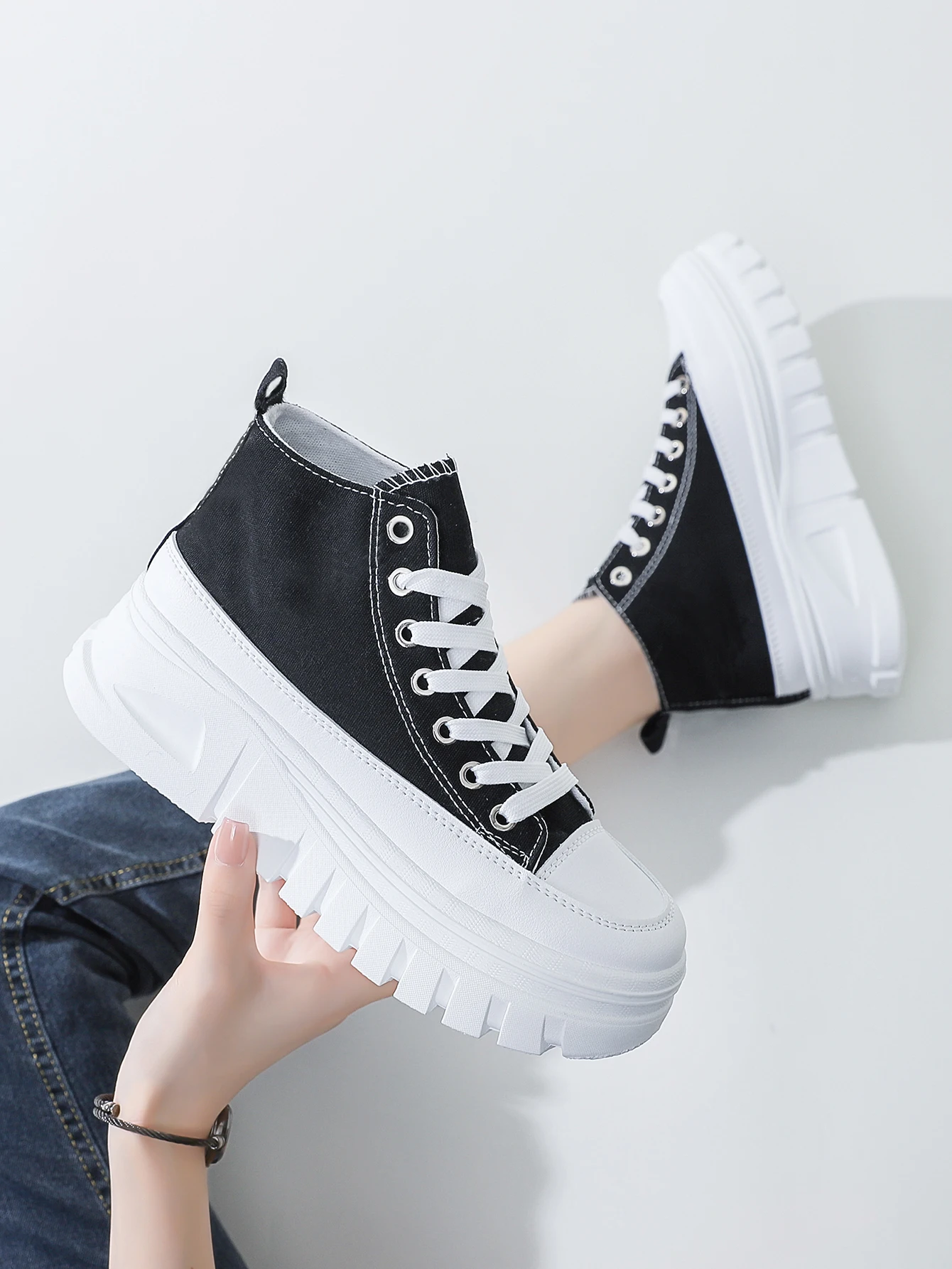 Women Lace-Up Front High Top Flatform Canvas Shoes Fashion Casual Comfortable Height Increasing Sneakers