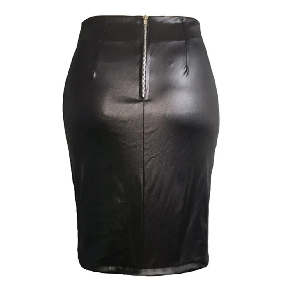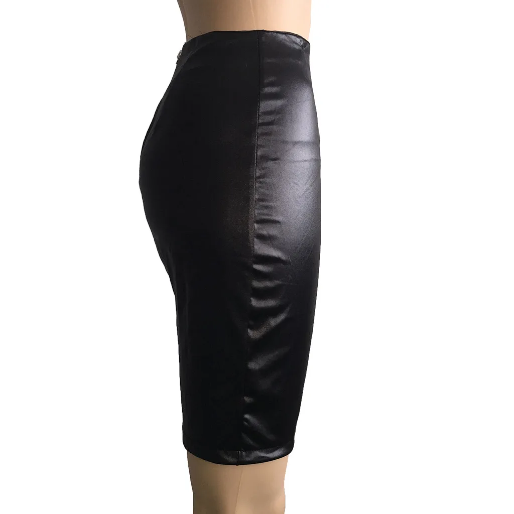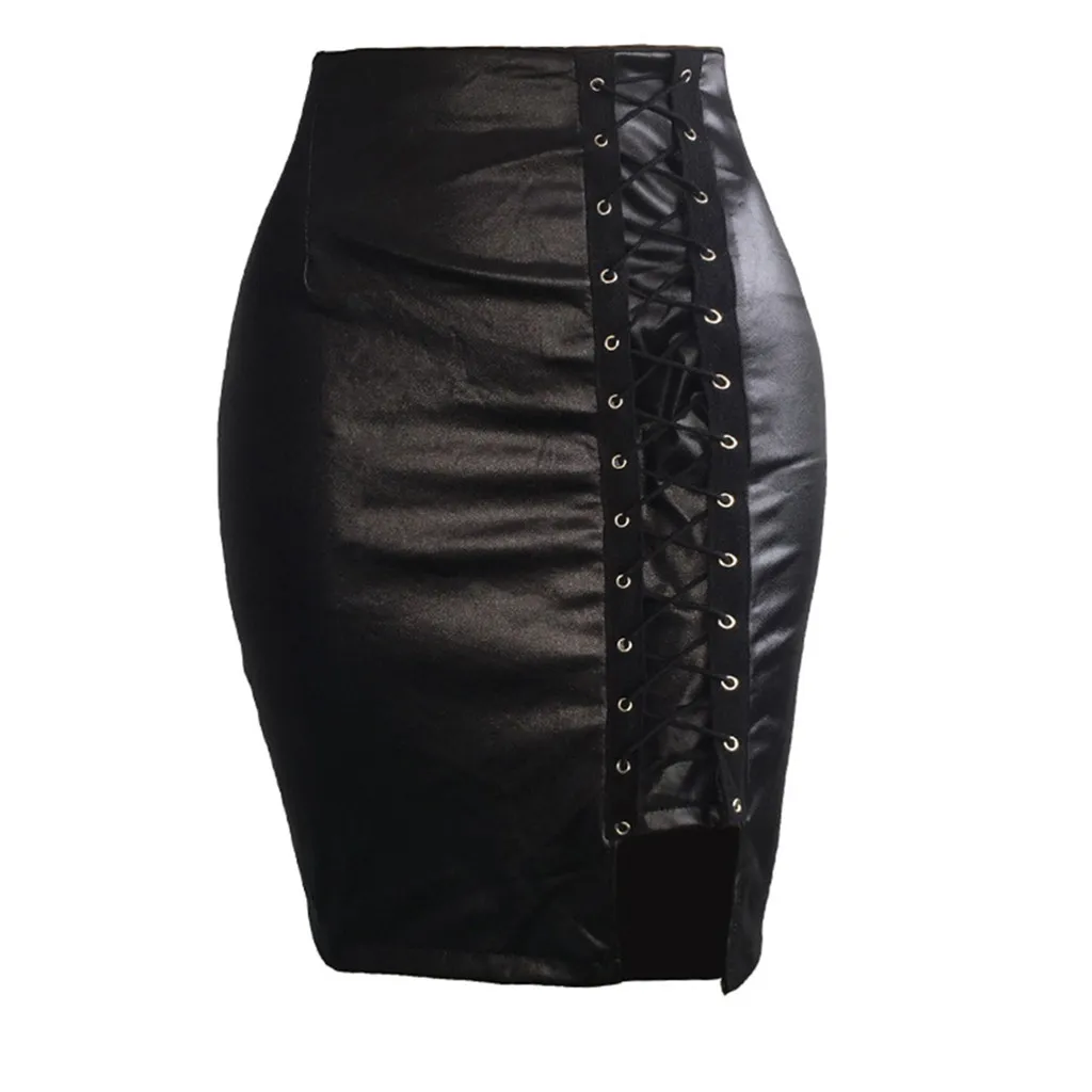 Women Ladies High Waist And Knee Skirt Bandage Split Sexy Hip Leather Skirt