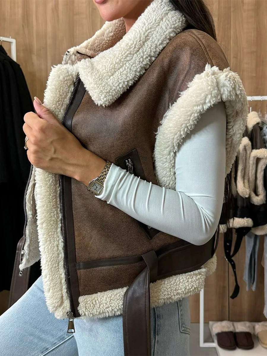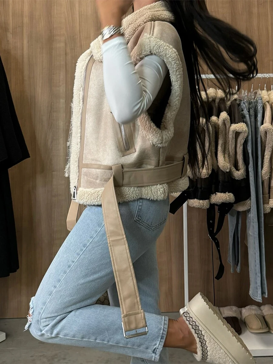 Women Leather Sherpa Vest Fur Collar Sleeveless Zipper Faux Suede Shearling Vest 2024 Biker Moto Jacket Winter Warm Outerwear