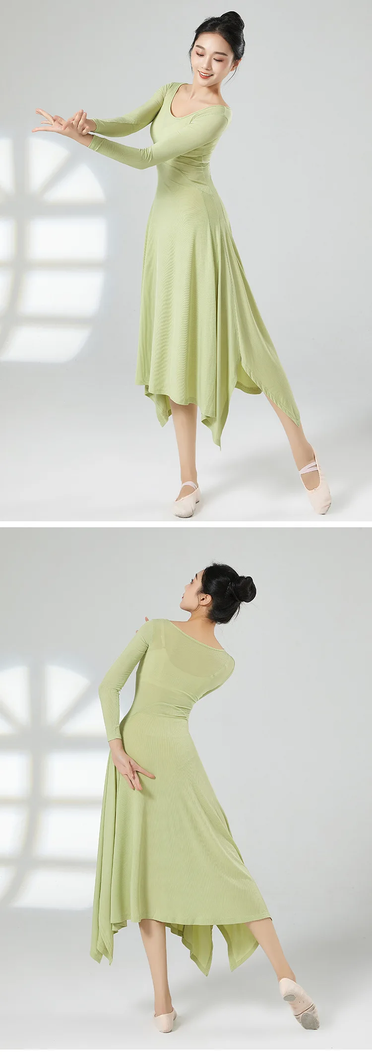 Women Modern Dance Long Dress Solid Ice Silk Practice Clothes Big U Collar Irregular Split Hemline Folk Dancer Worship Costume