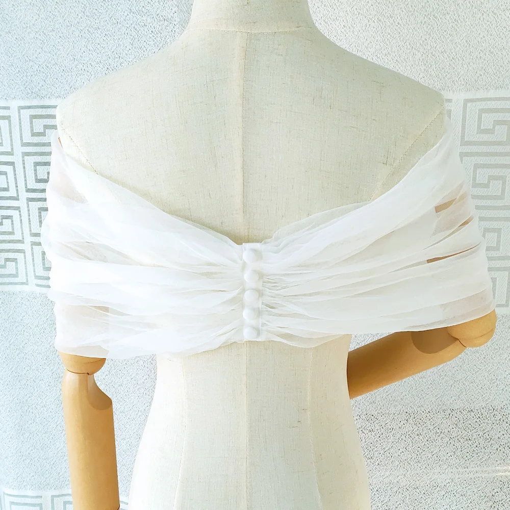 Women Pleated Tulle Sheer Wrap Wedding Bridal Off the Shoulder Stole Elegant Formal Shawl with Button Ivory Customizabl