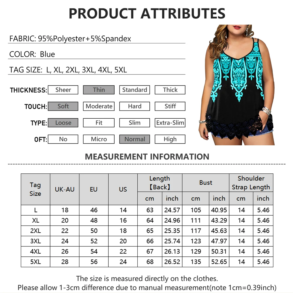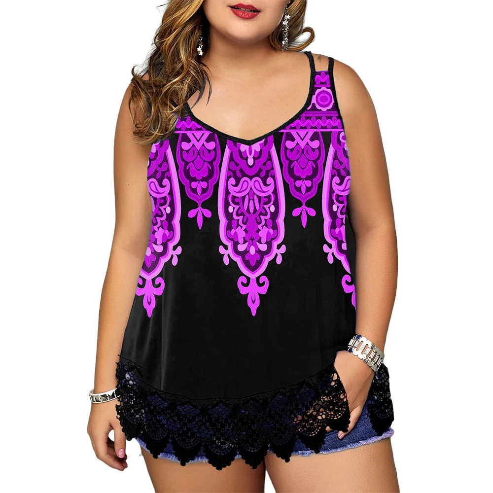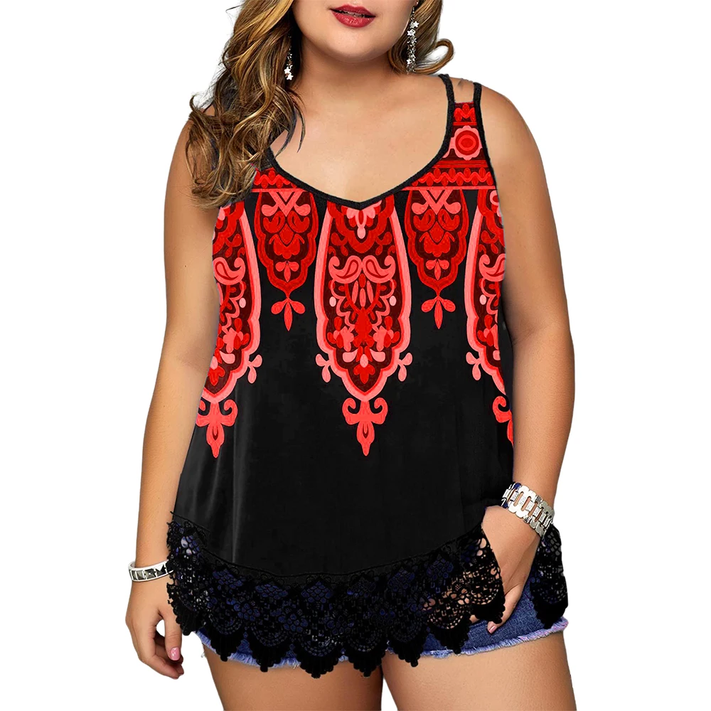 Women Plus Size Lace Hem Print Sleeveless Top Ladies Vest/Sling Summer New Loose Beach Sundress Casual Round Neck Camisole Top