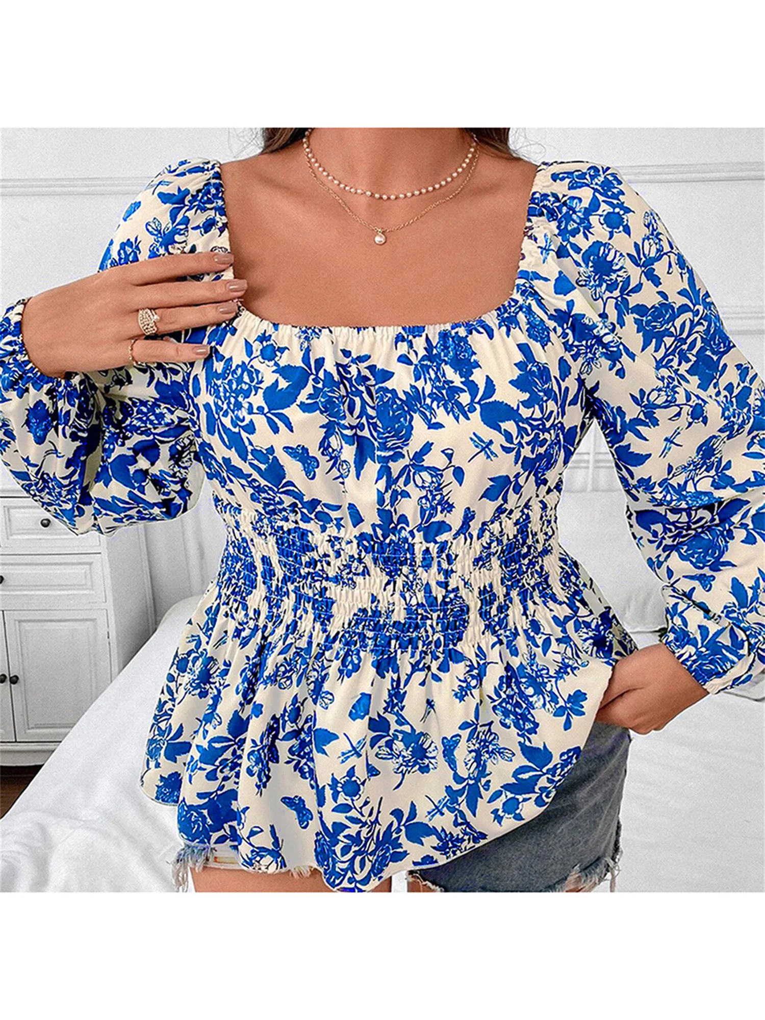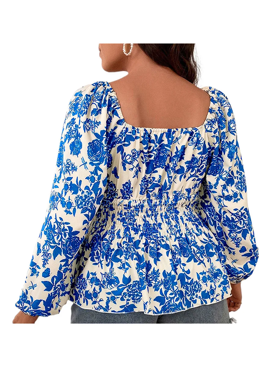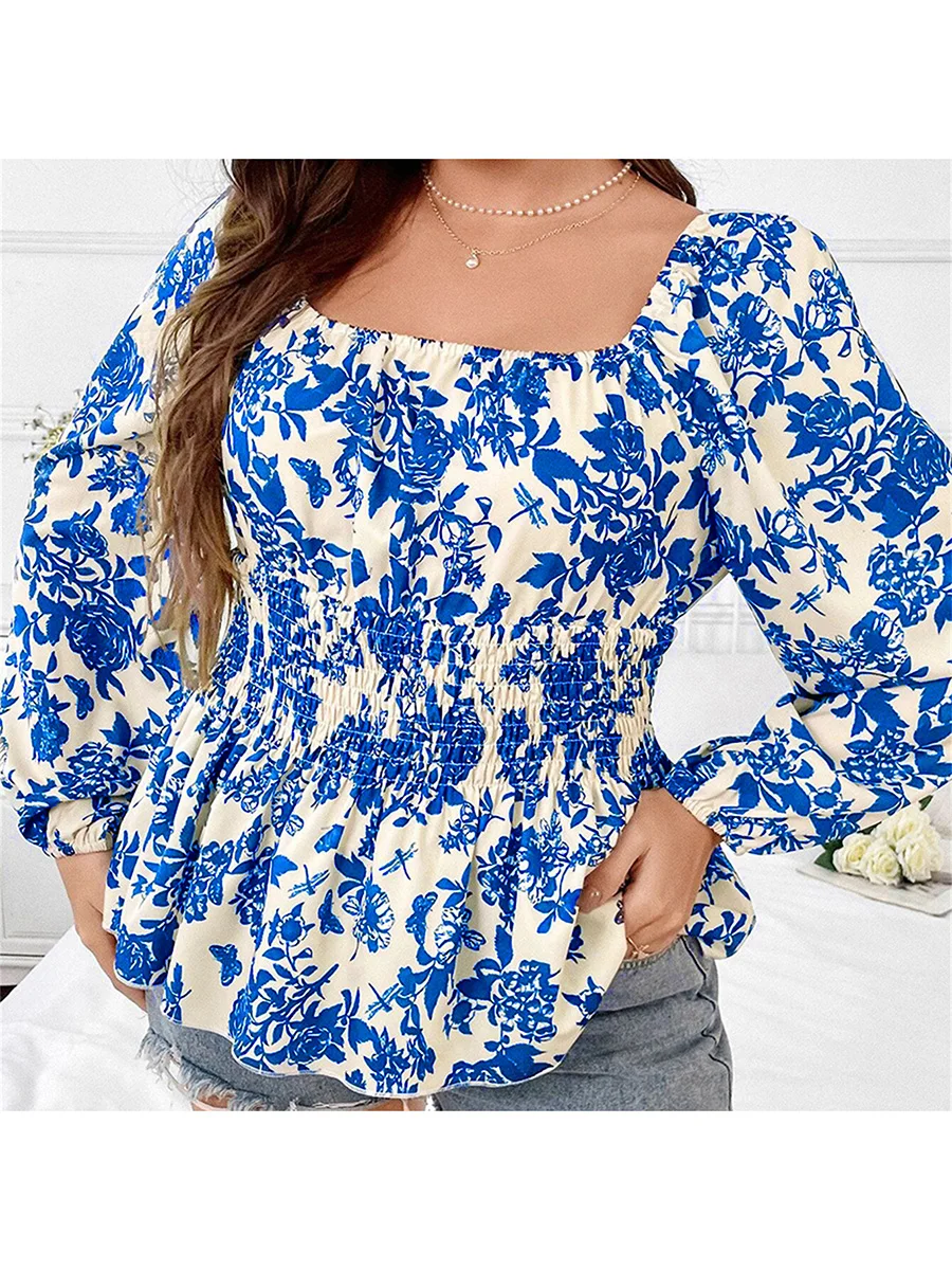 Women Plus Size Shirts Floral Print Long Sleeve Square Neck Fashion Blouses Spring Fall Casual Tops