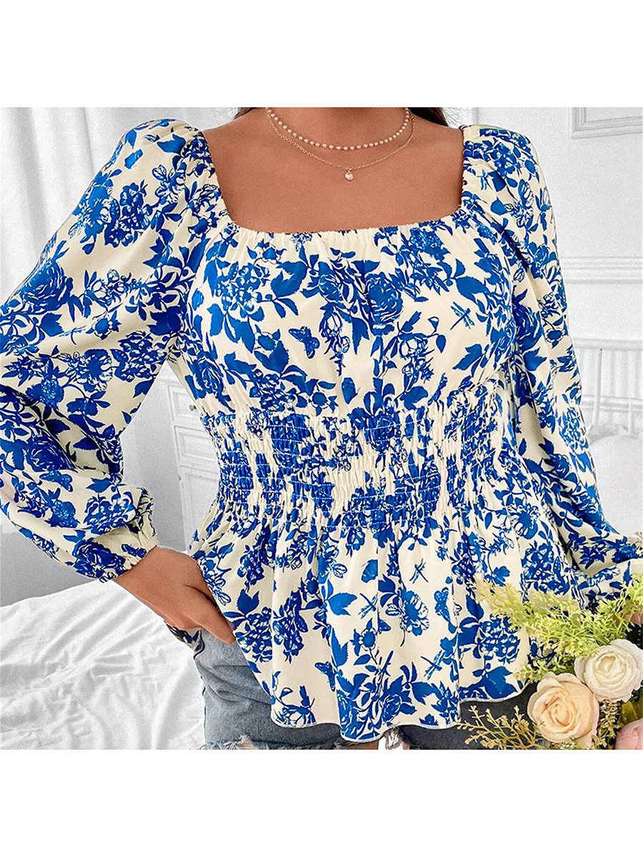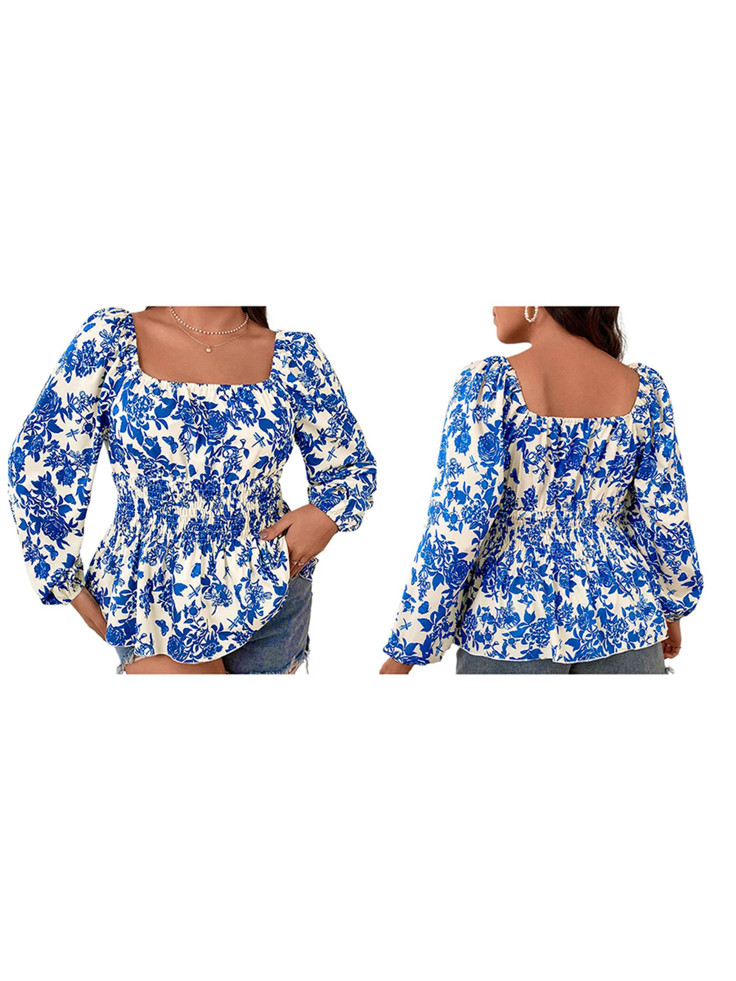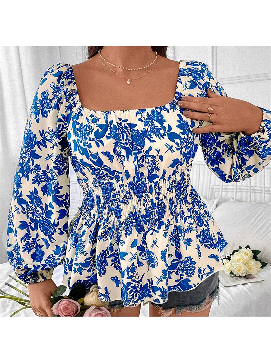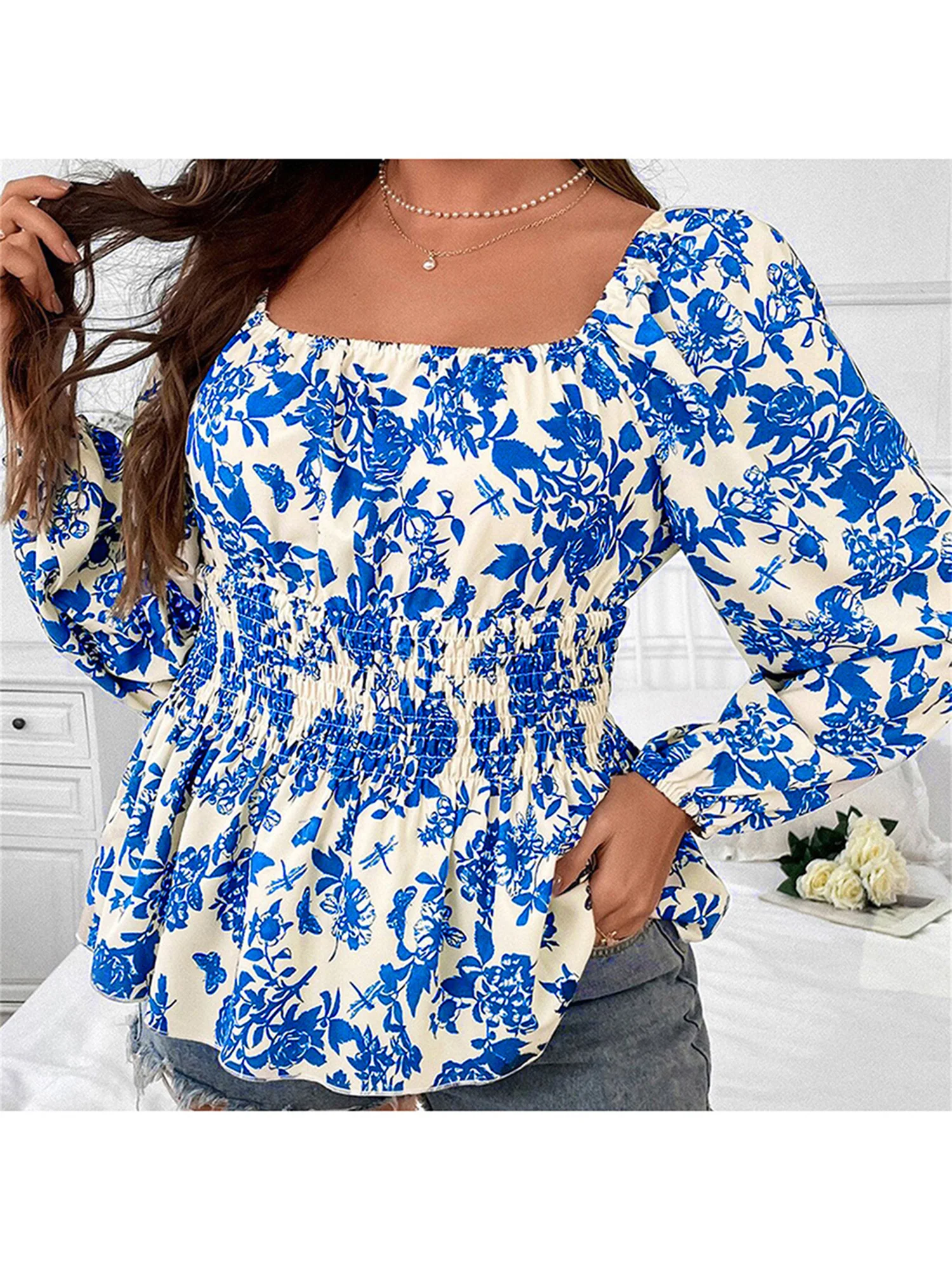 Women Plus Size Shirts Floral Print Long Sleeve Square Neck Fashion Blouses Spring Fall Casual Tops