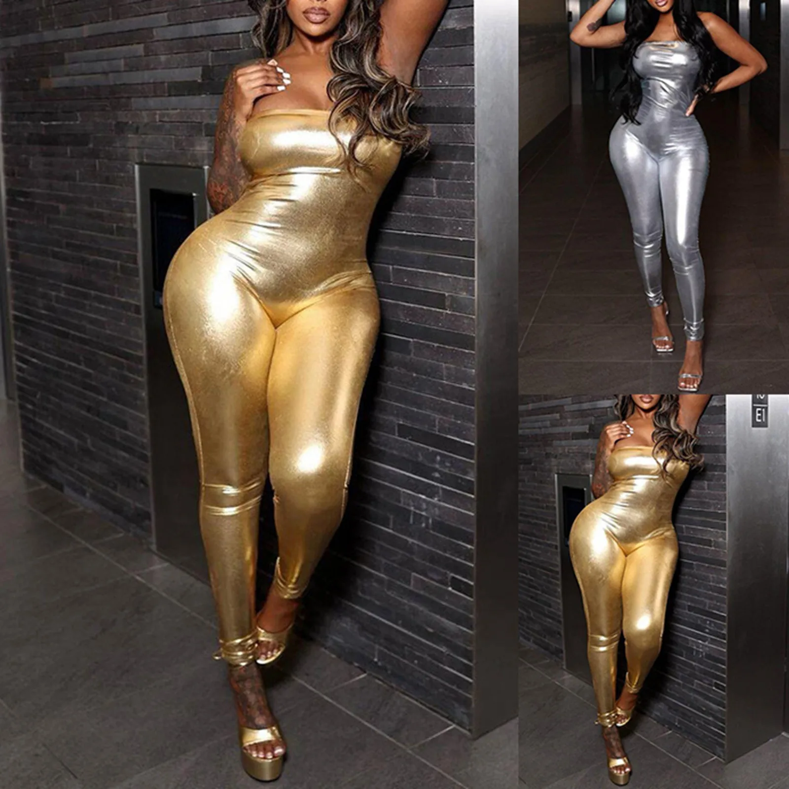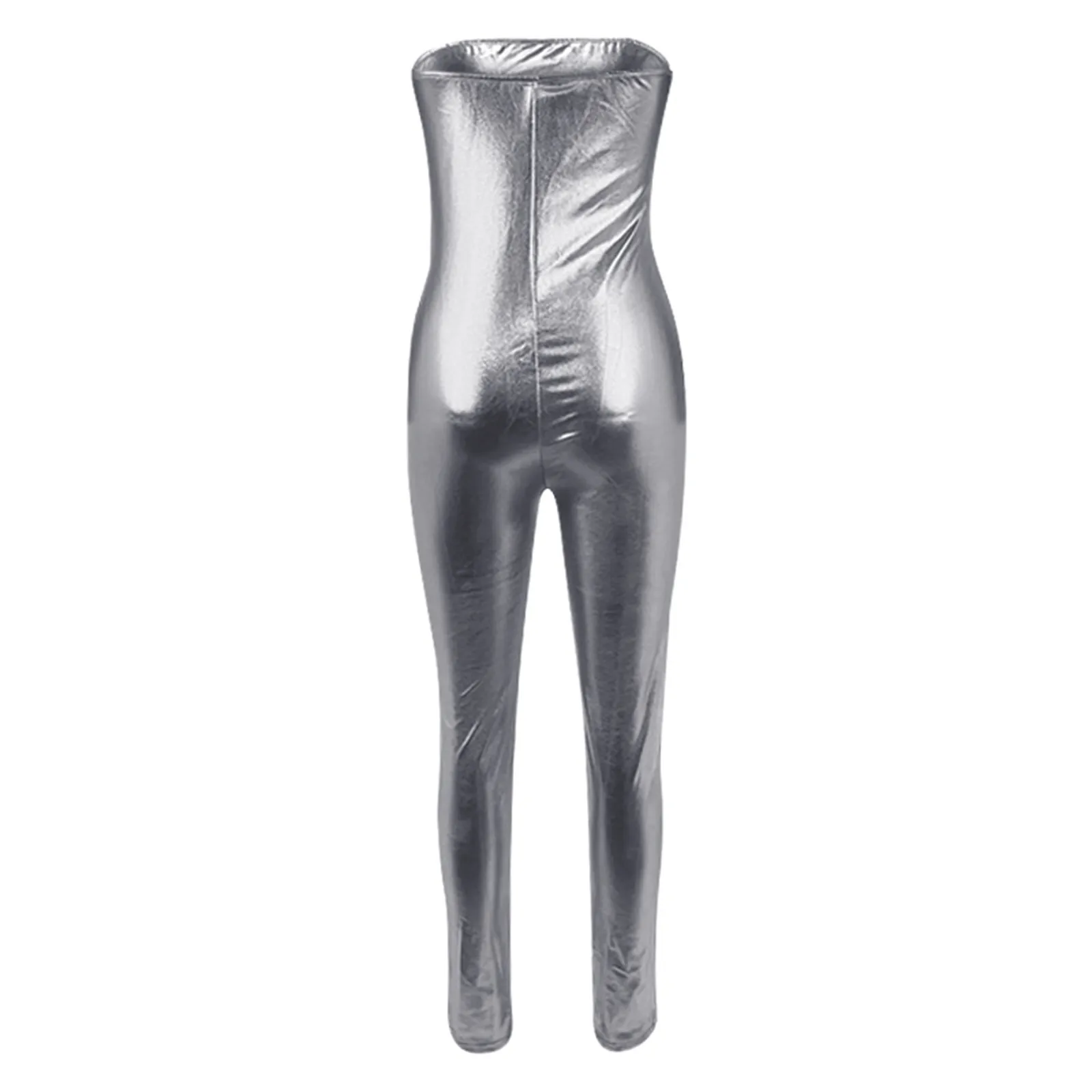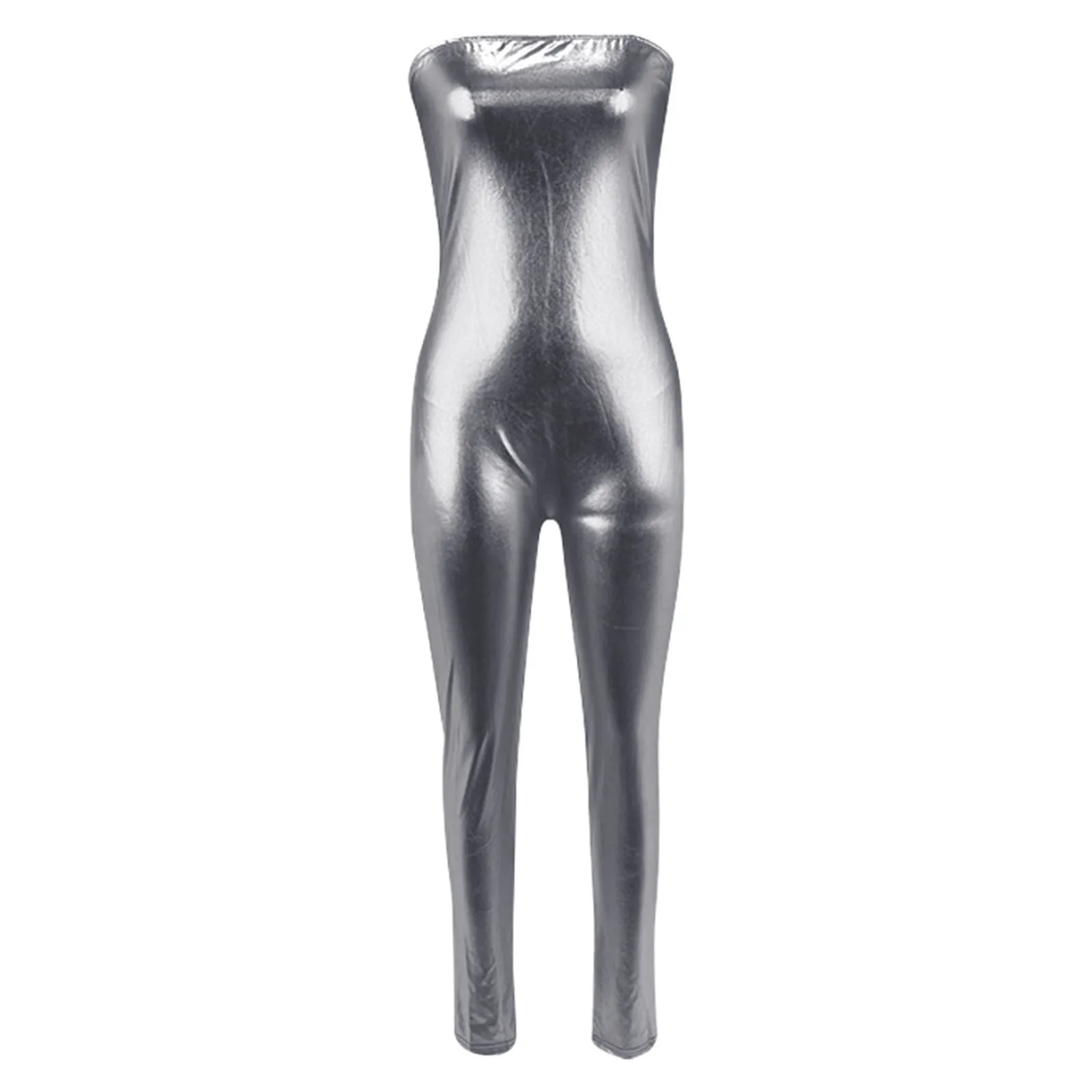 Women Shiny Silver Gold Pu Leather Jumpsuit Metallic Color Leather Romper Sleeveless Off Shoulder Slim Fit Jumpsuit Overalls