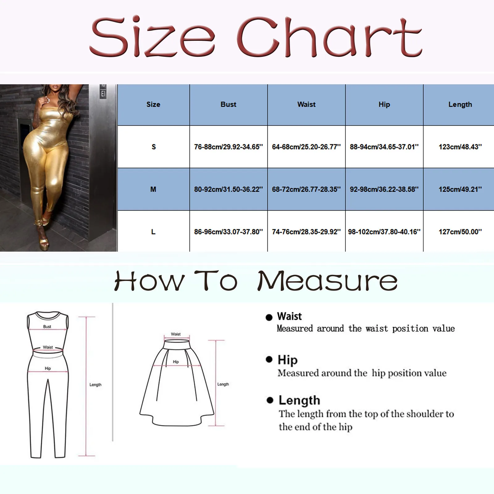 | Size:L | Top Bust:86-96cm/33.07-37.80” | Pants Waist:74-76cm/28.35-29.92” | Hip:98-102cm/37.80-40.16” | Length:127cm/50.00” |