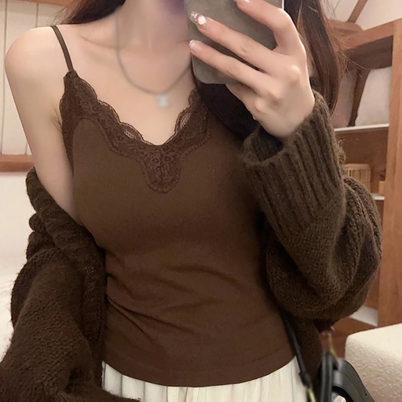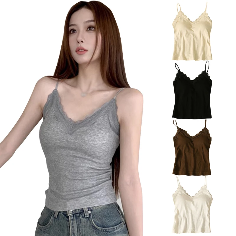Women Sleeveless Tank Tops Solid Color Korean Version V Neck Slim Fashion Lace Stitching With Chest Pad Camisole