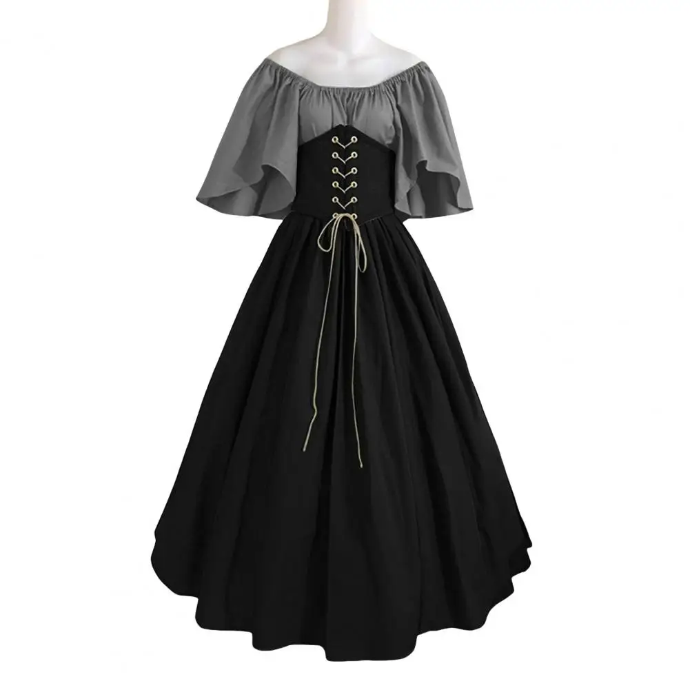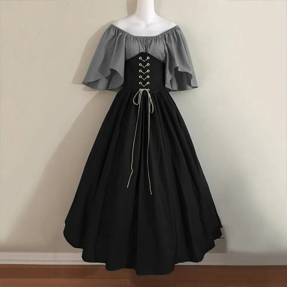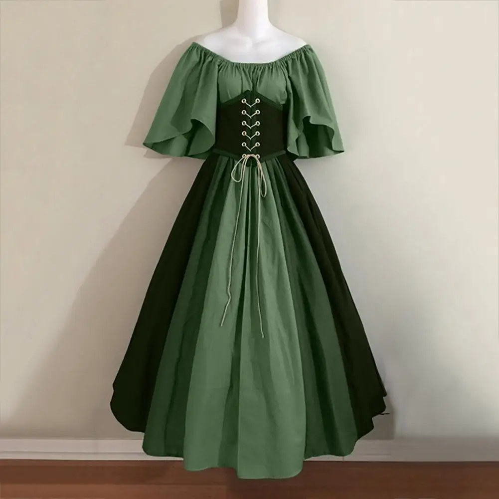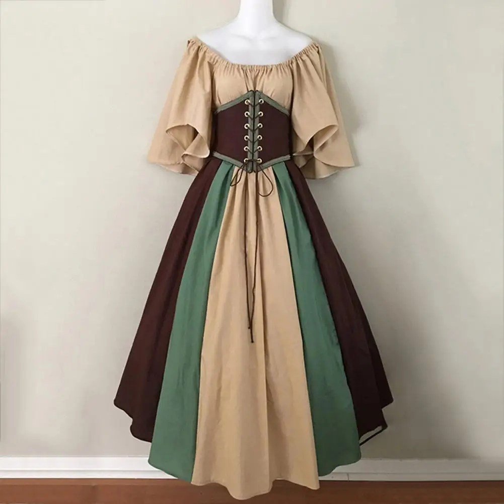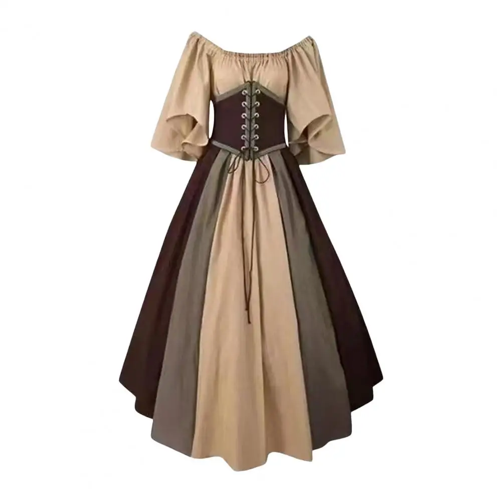 Vinatge Women Dress Flying Sleeve Contrasting Color A-line Big Hem Slim Waist Pleated Lace-up Strap Medieval Halloween Party Cosplay Costume Party Maxi Dress