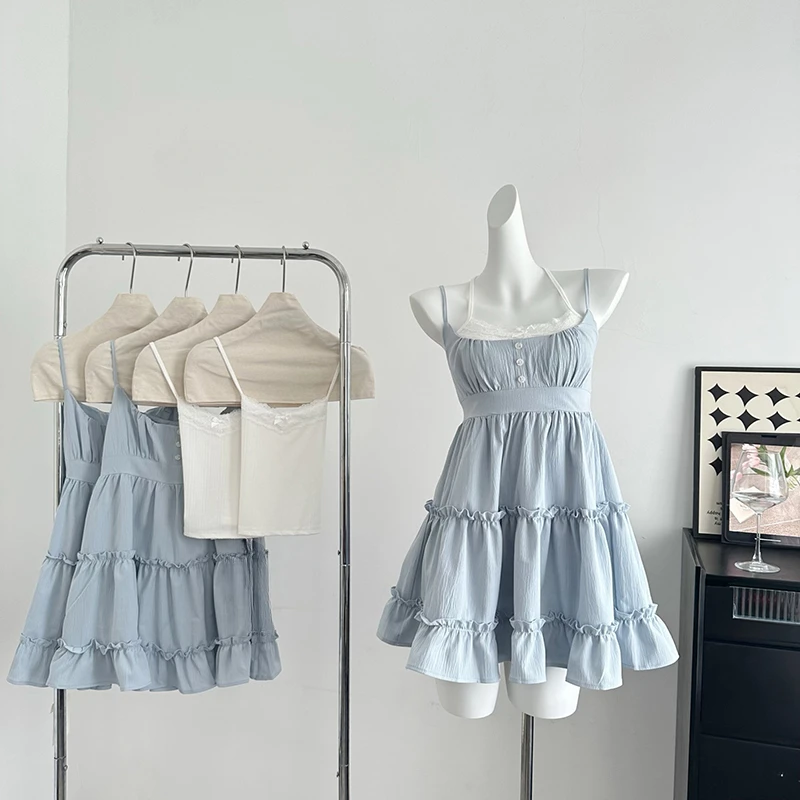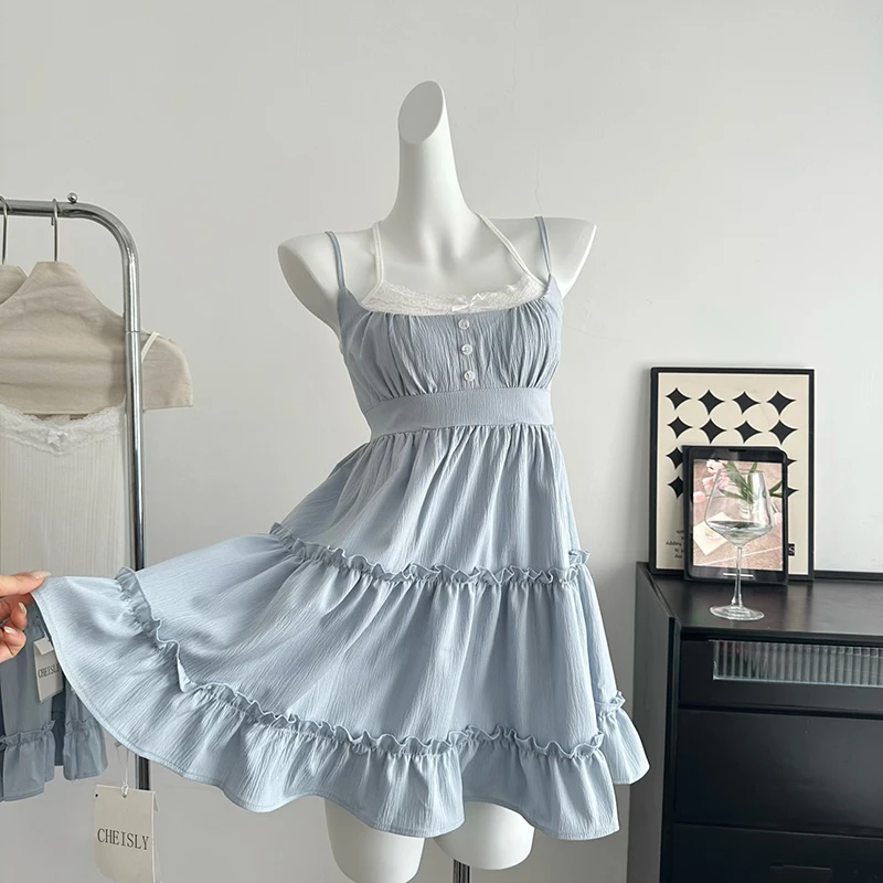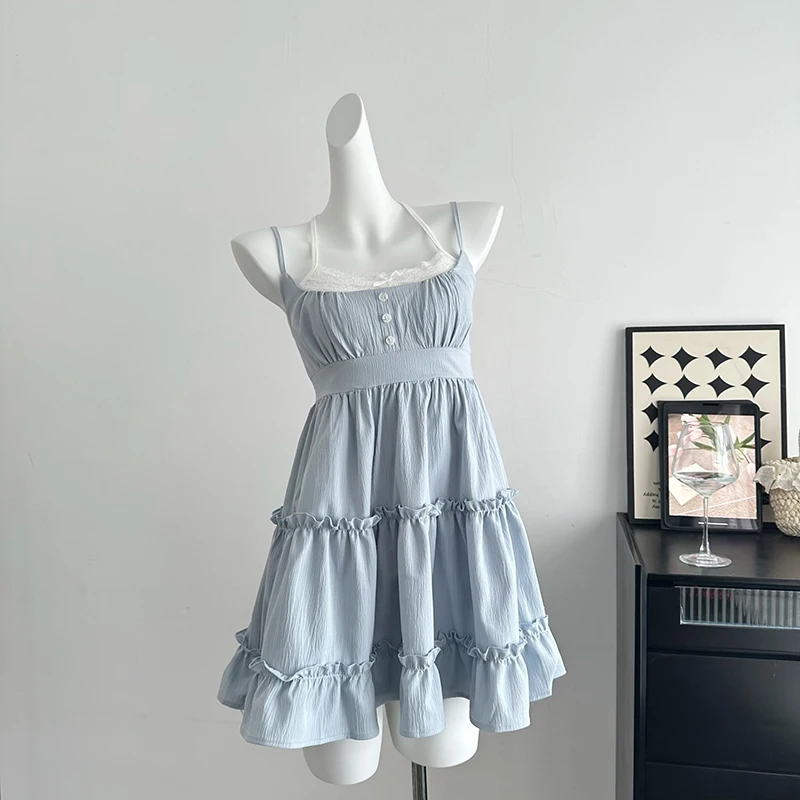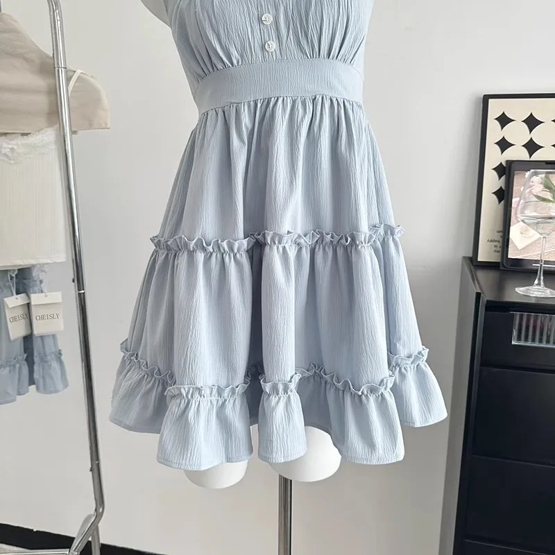 Women’s Cake Dress Off Shoulder Sleeveless Camis Dresses Pleated Hot Girls Blue Solid Sexy Short Skirts Summer Female Clothes