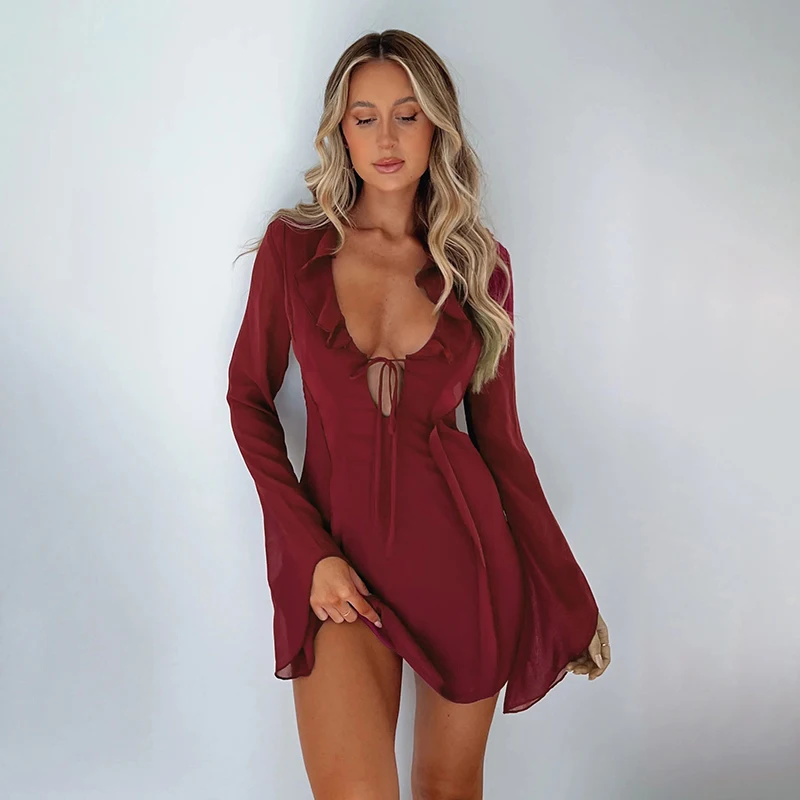 Women’s Elegant Short Dress 2024 Spring New Fashion Hundred Pure Color Ruffle Long Sleeve Tie Dress Women’s