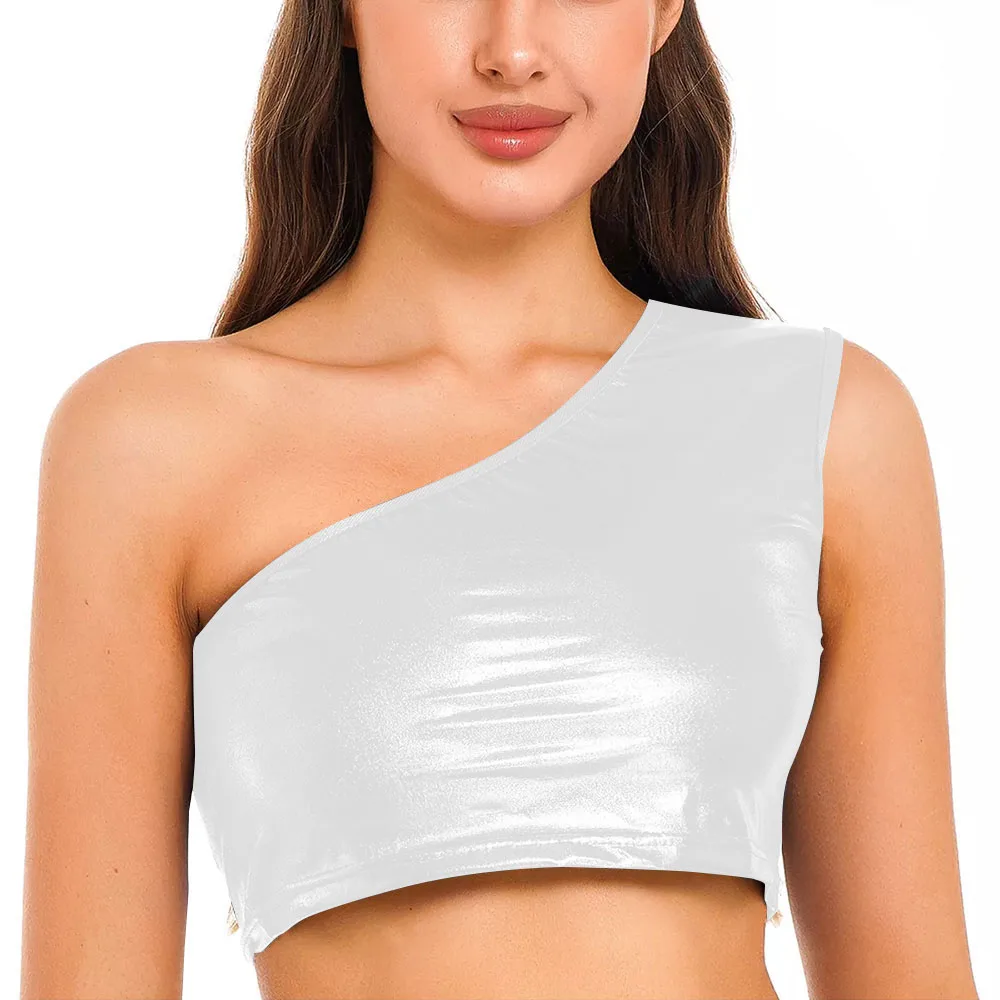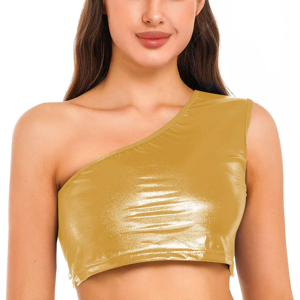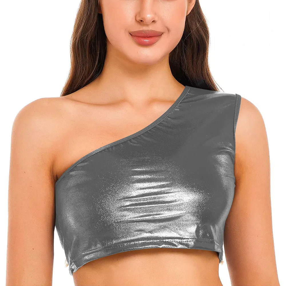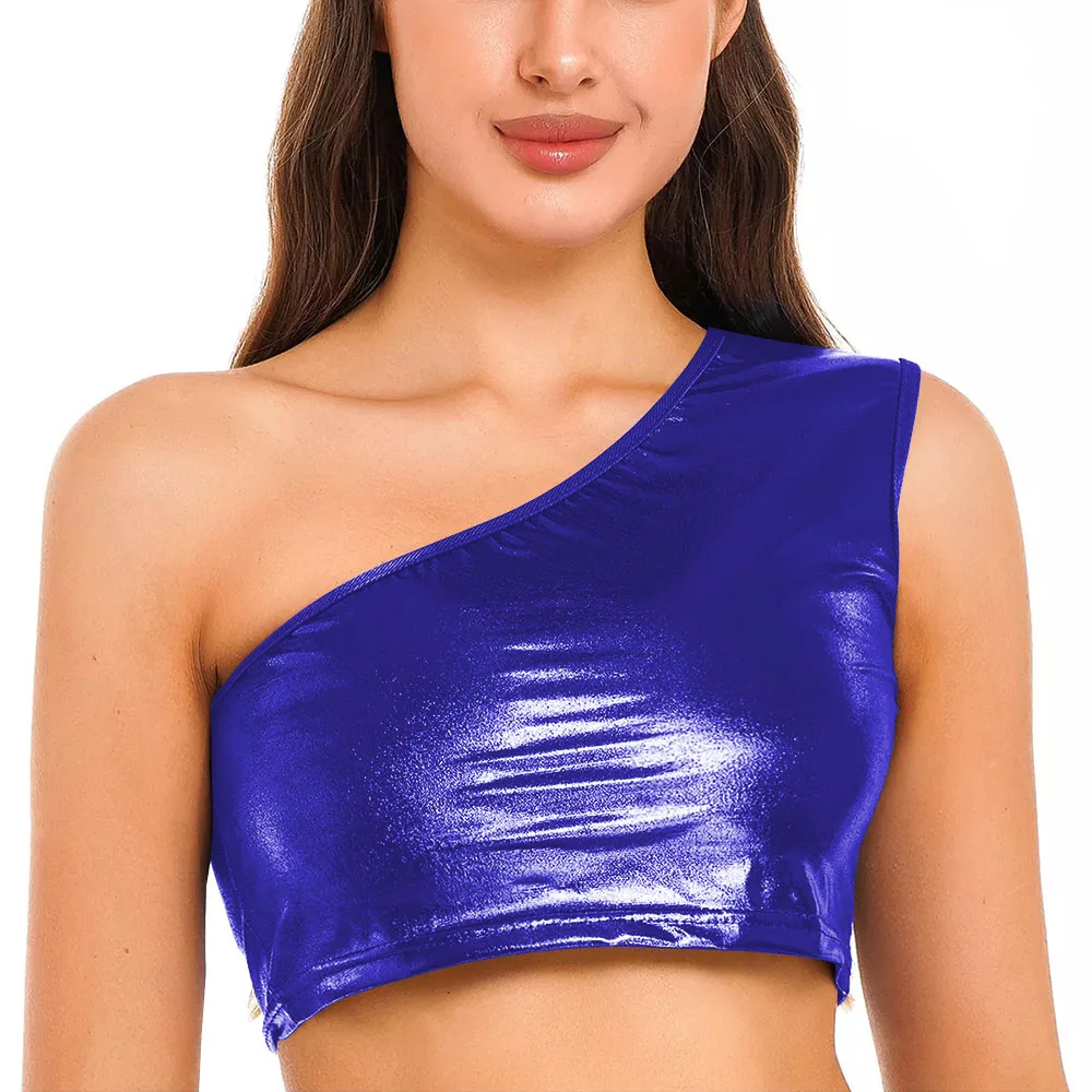 Womens Metallic Shiny Crop Top Plus Size One Shoulder Bodycon Top Fashion Blouse Camis Night Club Party Clubwear Slim Tank Vest