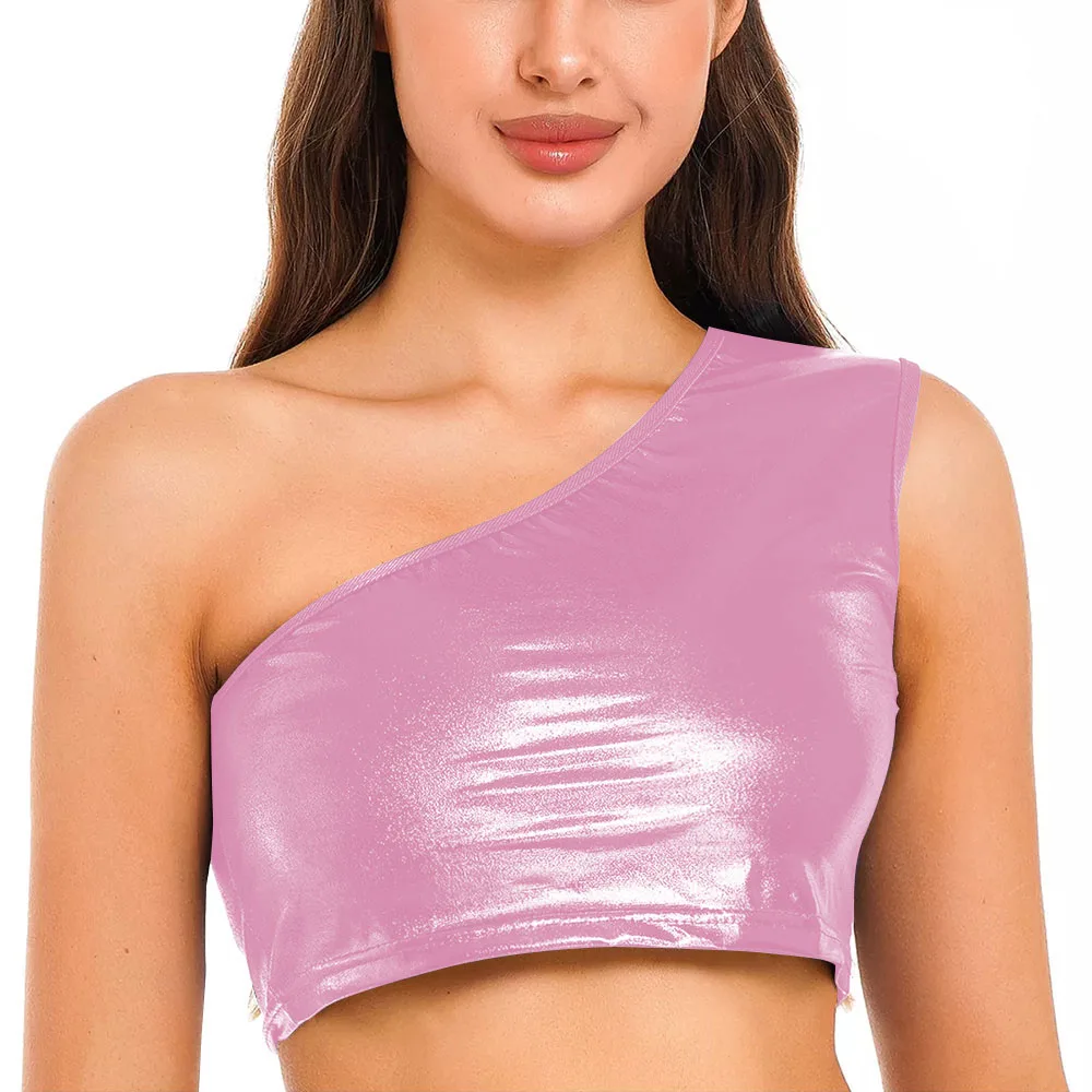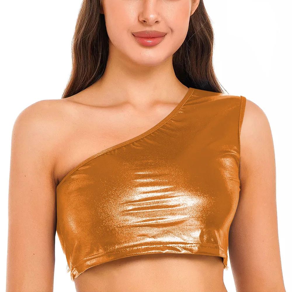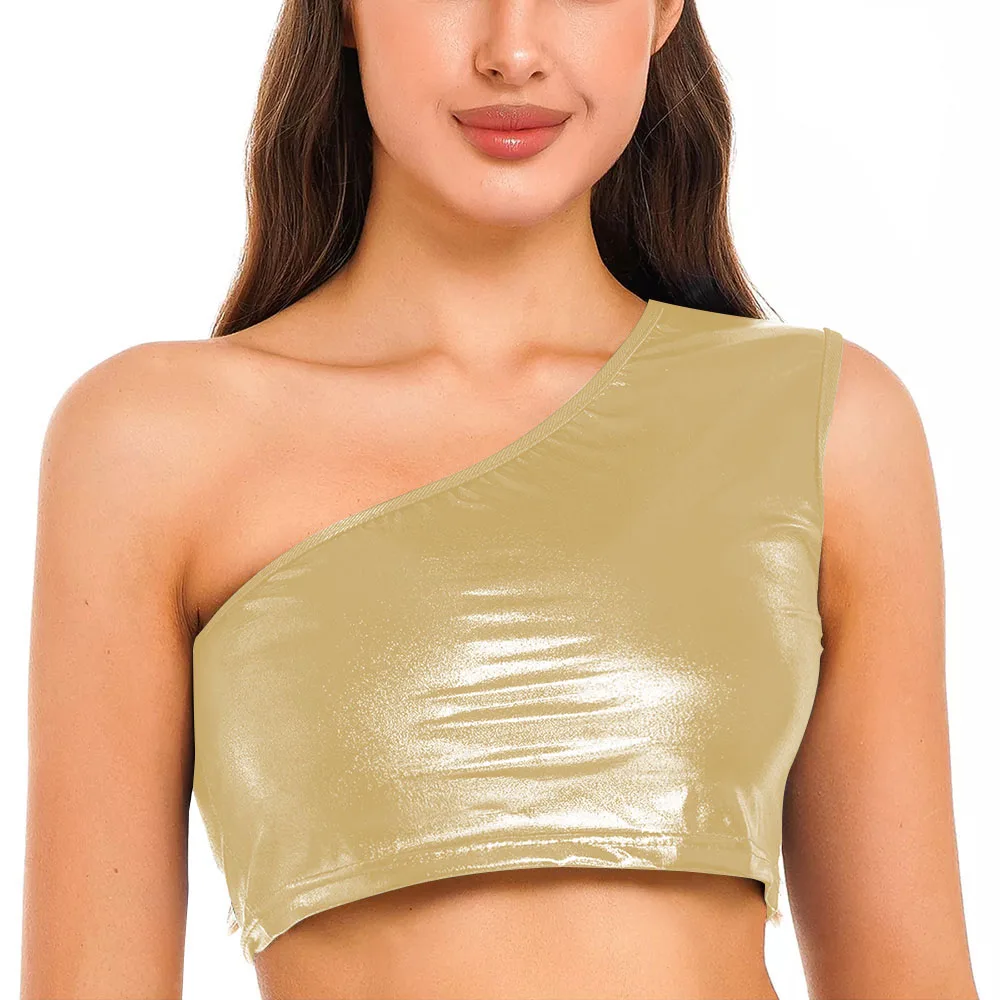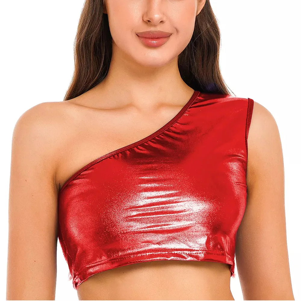 Womens Metallic Shiny Crop Top Plus Size One Shoulder Bodycon Top Fashion Blouse Camis Night Club Party Clubwear Slim Tank Vest