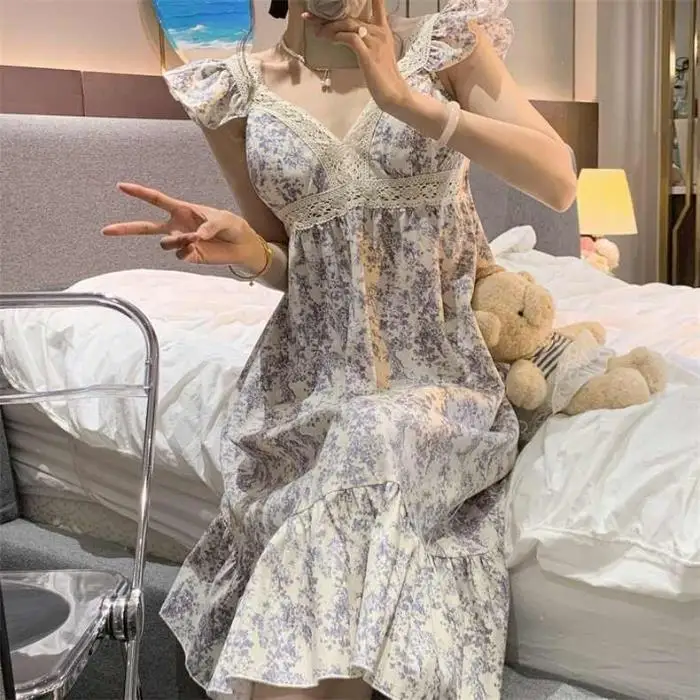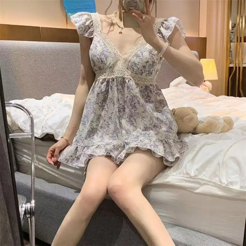 Women’s New Nightgown Homewear Summer Sling Pajamas Homewear Nightgown Korean Lace Lace Casual Short-Sleeved Shorts Homewear