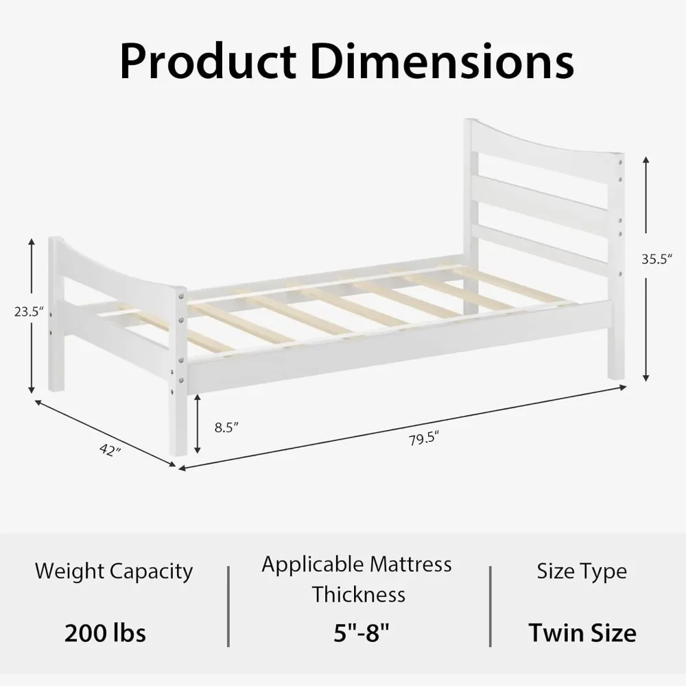 Wood Twin Bed Frame, Modern White Platform Bed w/Headboard & Footboard, Solid Wood Slat Support, No Box Spring Needed
