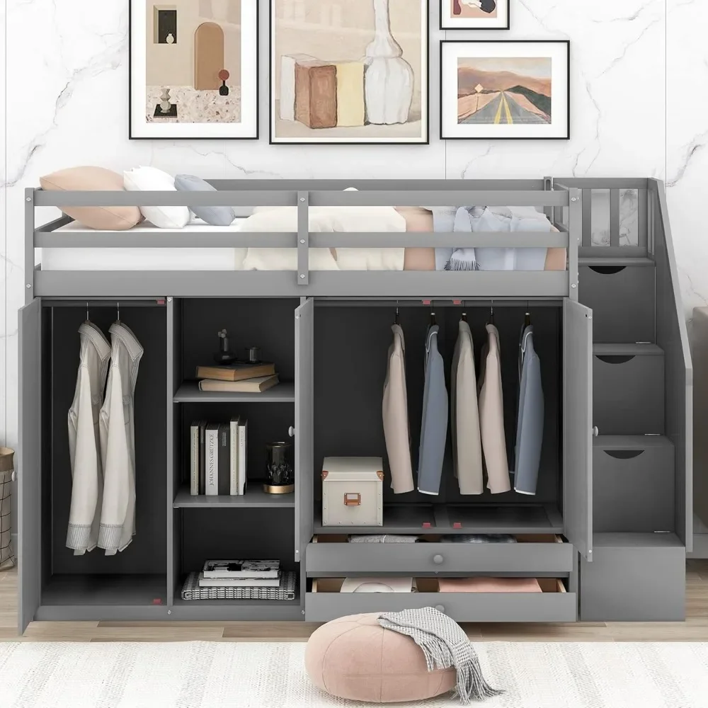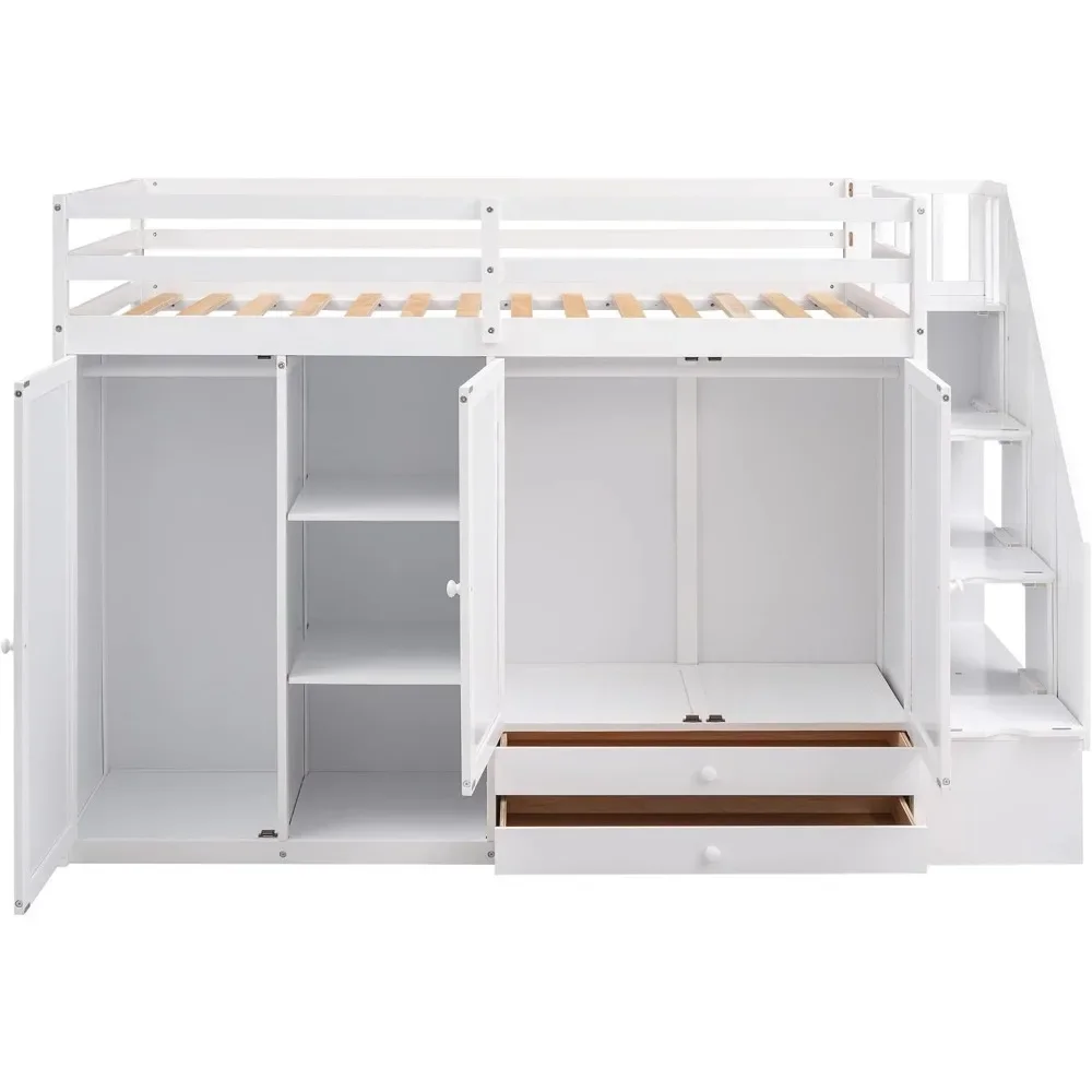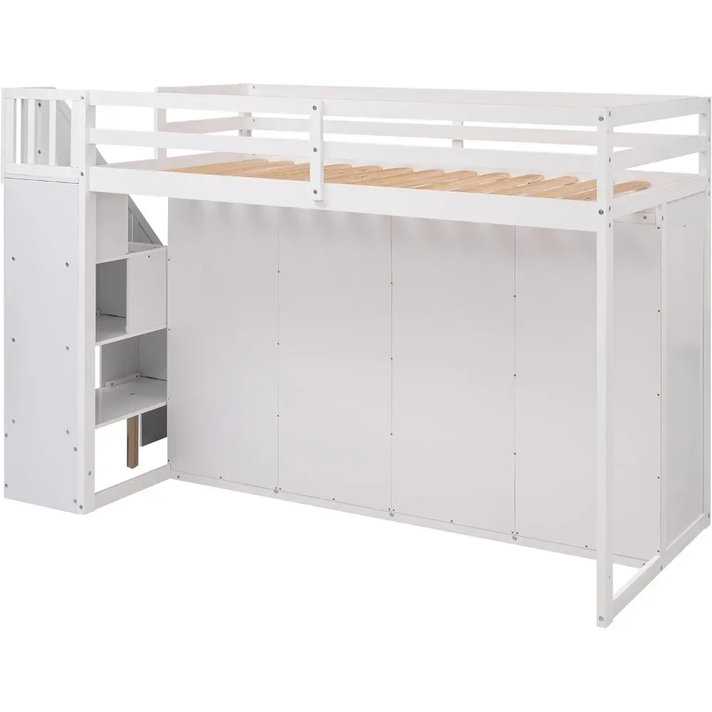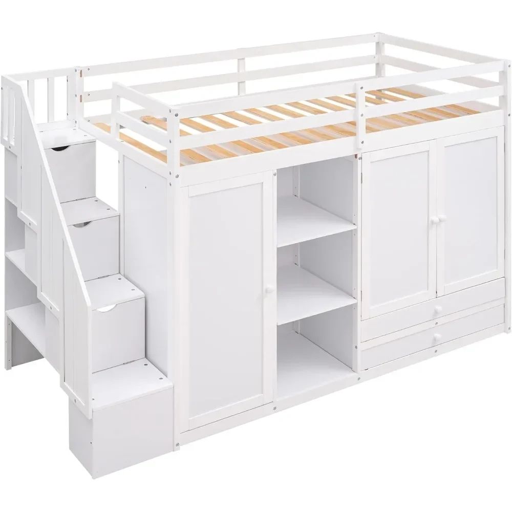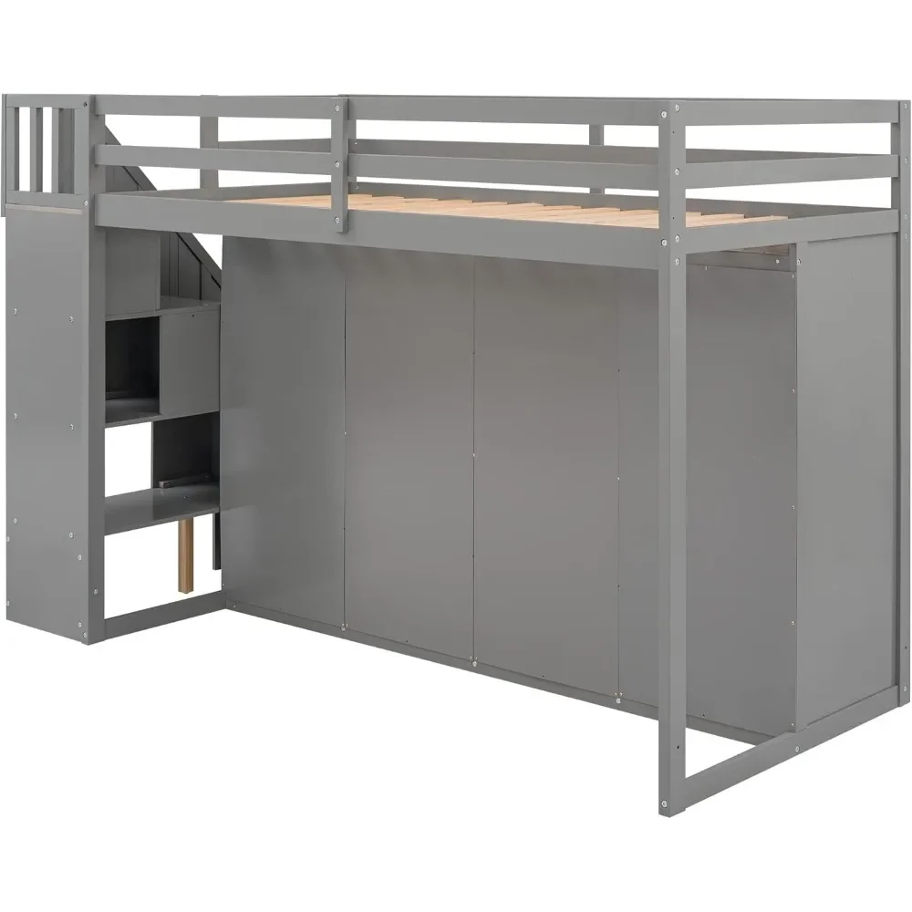 Wood Twin Loft Bed with Stairs, 2 Drawers and 3 Shelves, High Loft Bed Frame with Wardrobe, No Box Spring Needed Children Beds