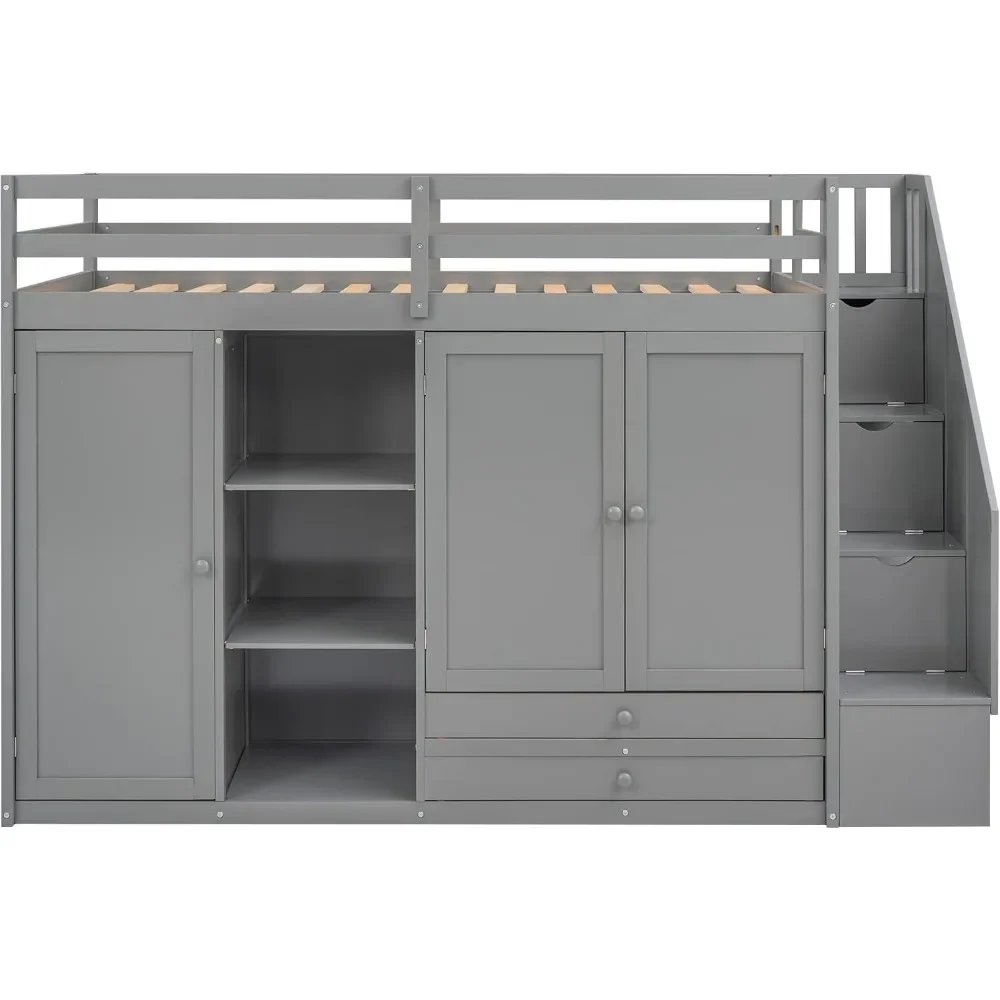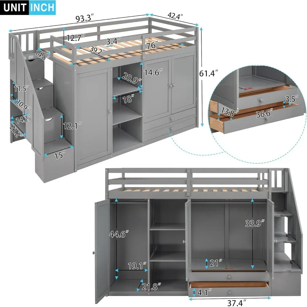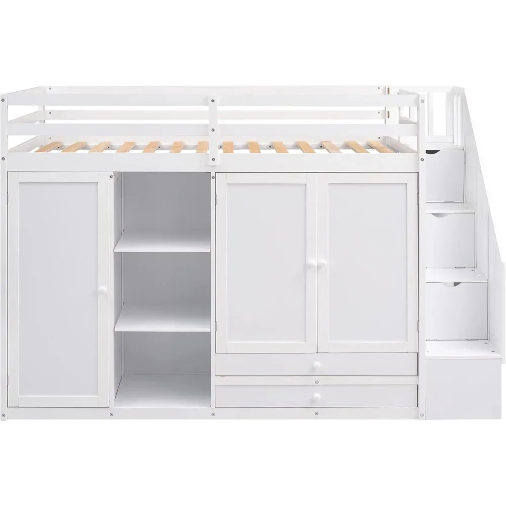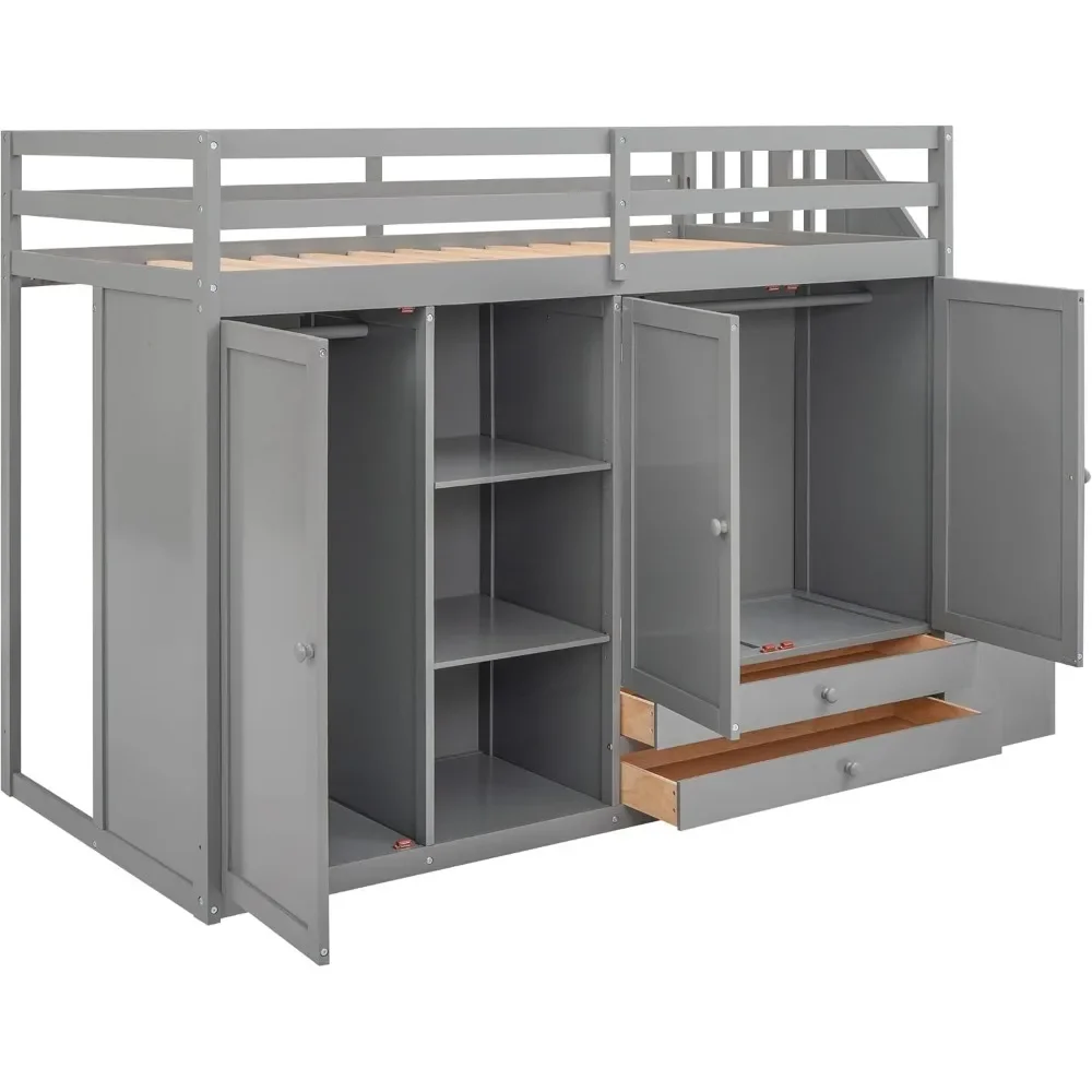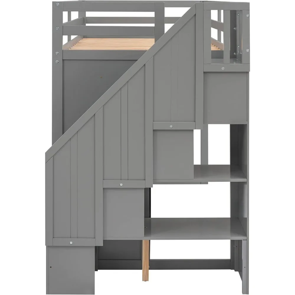 Wood Twin Loft Bed with Stairs, 2 Drawers and 3 Shelves, High Loft Bed Frame with Wardrobe, No Box Spring Needed Children Beds