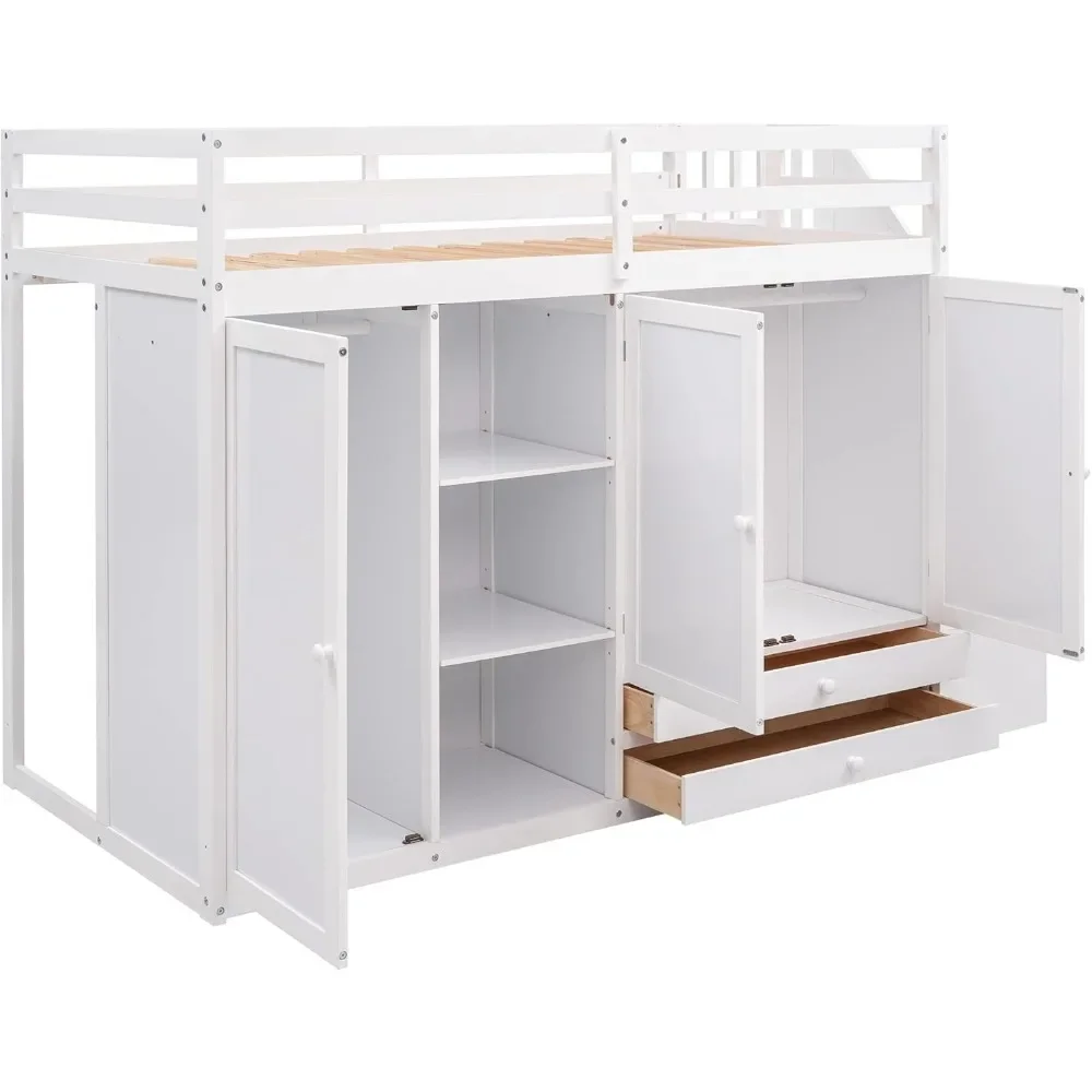 - 【Loft Bed with Wardrobes, Shelves and 2 Large Drawers】 This twin loft bed has huge storage space. With this loft bed you will get 2 cabinets, 2 large drawers and 3 shelves between the two wardrobes.