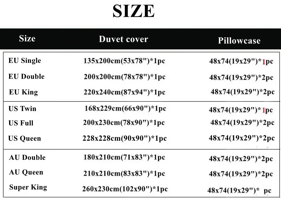 6. Package: US Twin/UK Single/AU Single are 2pcs/set (1x Duvet cover, 1x pillowcase).