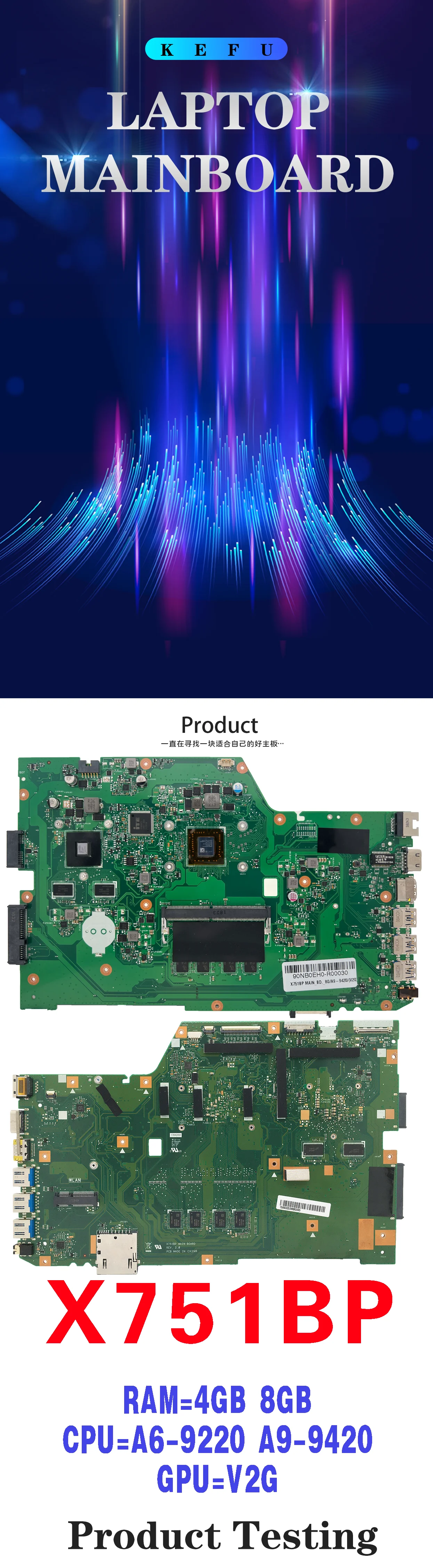 X751BP Mainboard For ASUS VIVOBOOK X751B Laptop Motherboard With CPU A6-9220 A9-9440 4GB/8GB 100% Test Well