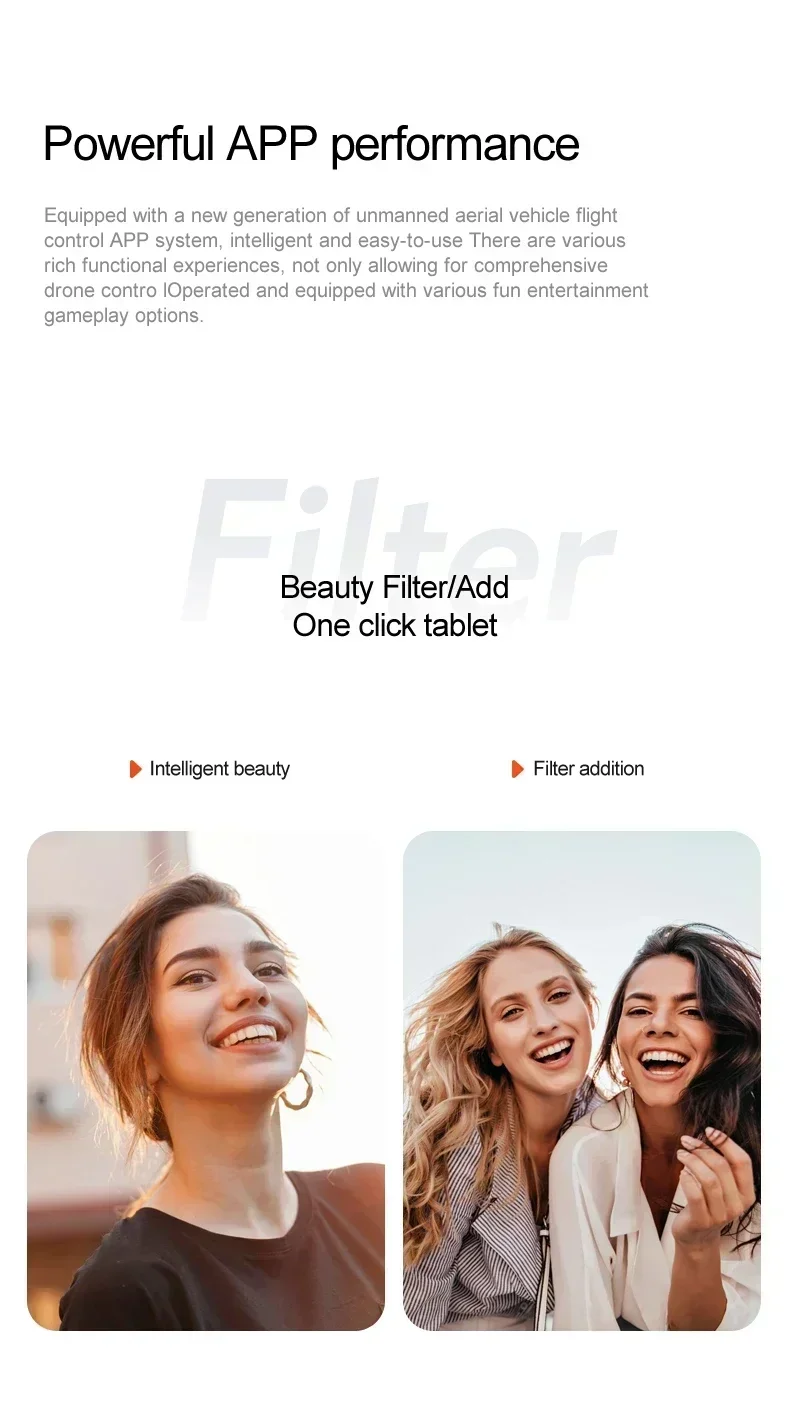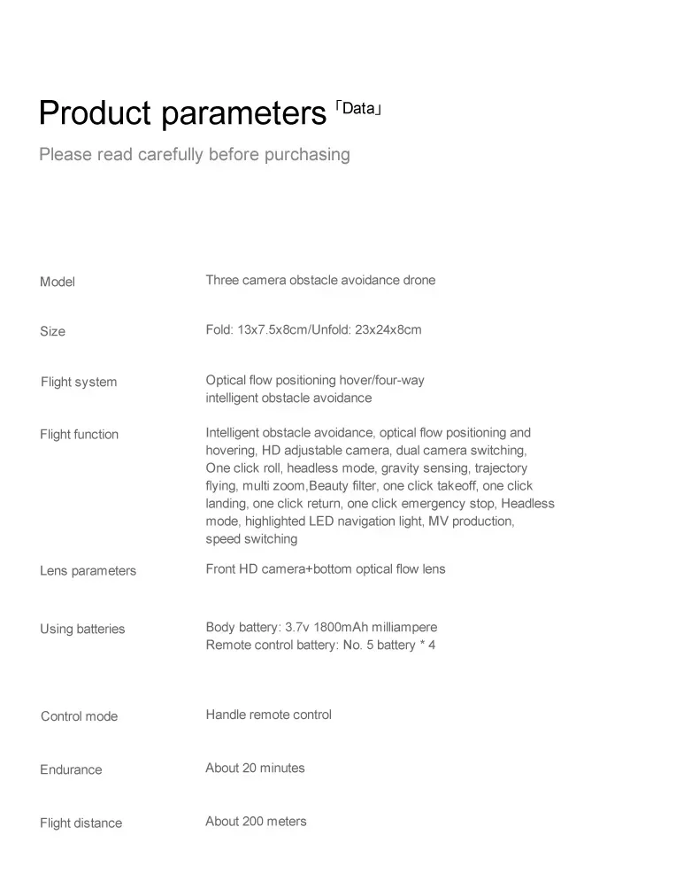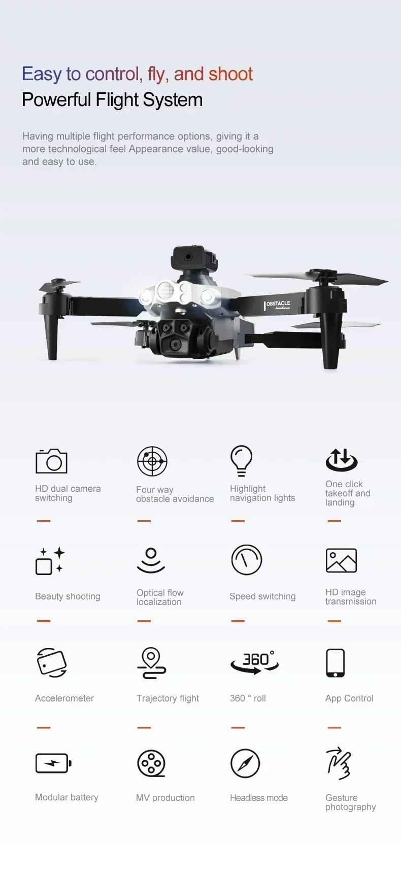 One-key take-off/one-key landing/ascent/descent/left/right direction/360° roll/headless mode/speed/slow speed/photo/video/dual camera switch/automatic photo face recognition/gravity sensor/ runway flight/