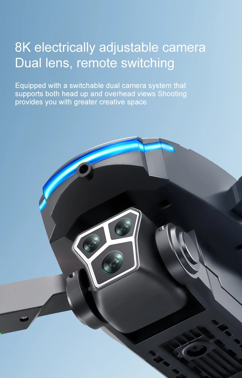 1. The front lens is placed with wide-angle 8K high-definition WIFI, and the optical flow high-definition lens at the bottom can switch the camera angle. The servo gimbal design increases stability, and EIS electronic image stabilization is added to make the picture lines clearer